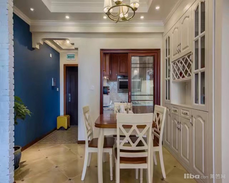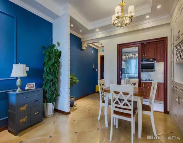 椭圆形桌面,细致的曲线作为桌角、蓝色墙面、美式吊灯,餐边柜,在美观的同时兼备储物功能