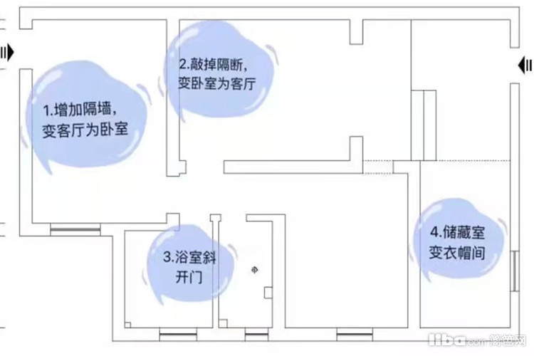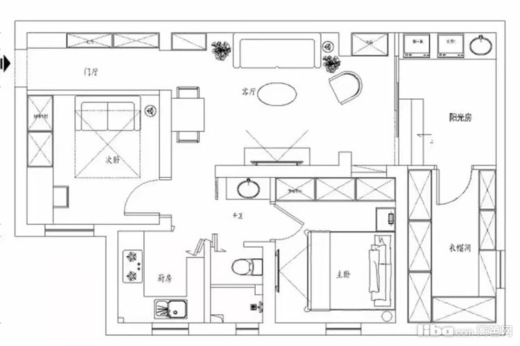 户型布局图,及衣帽间。原本和阳光房通告的储藏室,被设计师改为层高2米的衣帽间,压缩层高也有防潮的目的