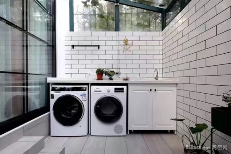 阳台周边上下都做了防潮处理,并贴上瓷砖隔绝湿气,摆上洗衣机烘干机,成为硕大的洗衣工作间