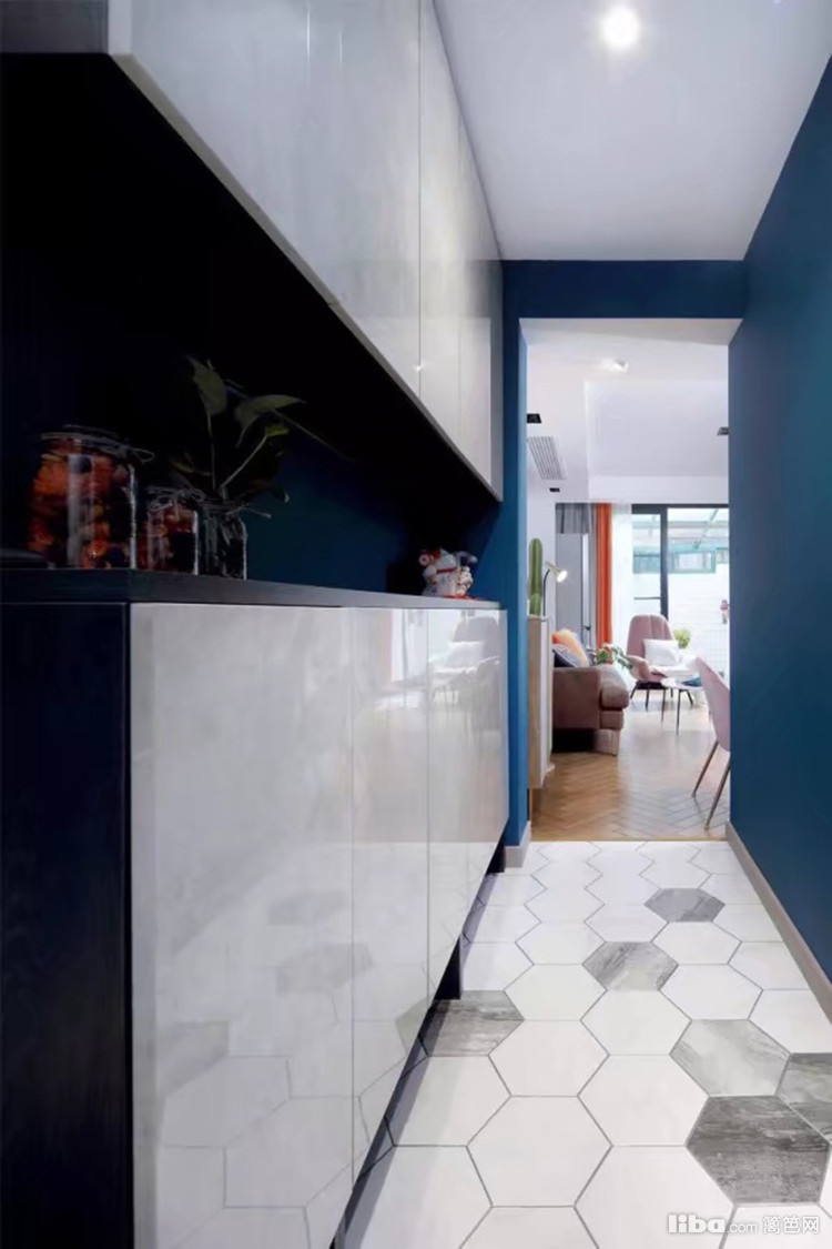 经过改造,一进门看到的不再是昏暗的客厅,而是一条长约3米的门厅走道,安置了4扇仿大理石纹亮面门柜,用来放鞋,容量非常宽裕。