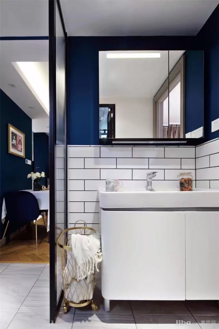 连体台盆和隔断之间,留出27厘米的间距放窄身脏衣服篮,金色铁艺多了一份小奢味道