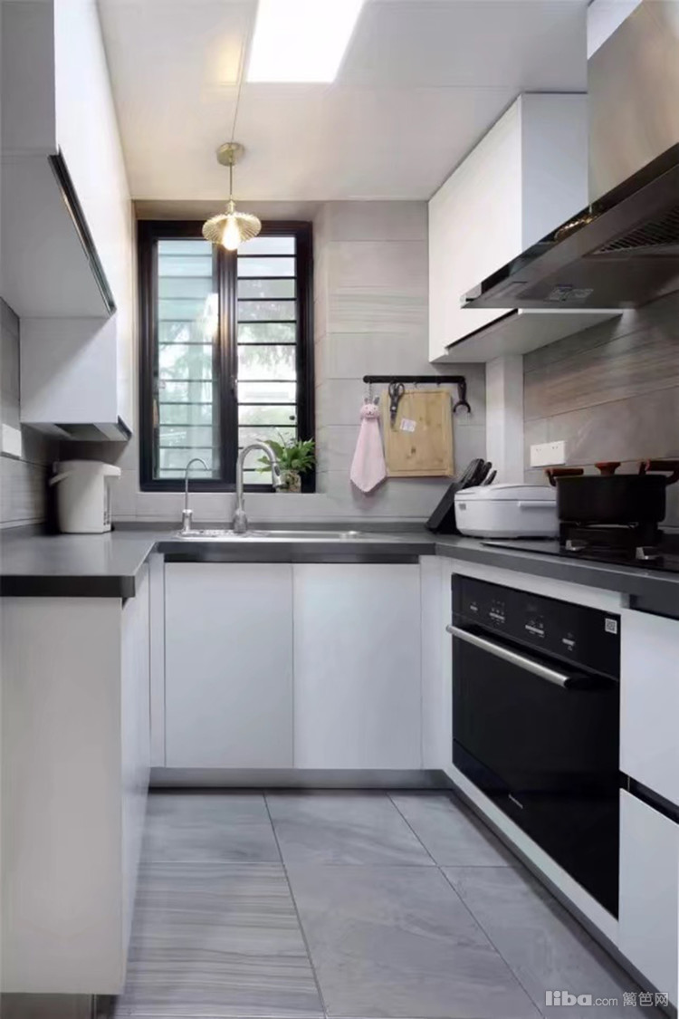 U型的小厨房,白色烤漆面板+灰黑台面,干净整洁,全是实用功能的设计