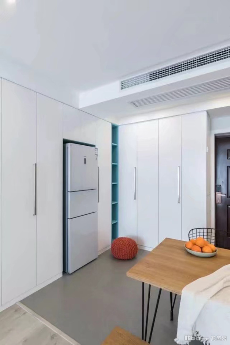 到顶的玄关鞋柜,L型的柜子设计满足了所有的收纳需求,冰箱也被嵌入了柜子当中,把玄关鞋柜和餐厅的餐边柜结合在一起,也更为节约空间。