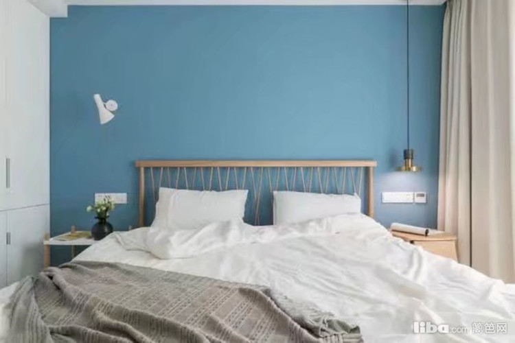 主卧室内以蓝色作为墙面背景,搭配原木风的家居和白色的床品,给人一种简洁、舒适的感觉,床头两侧的壁灯与吊灯的搭配,也更有创意感