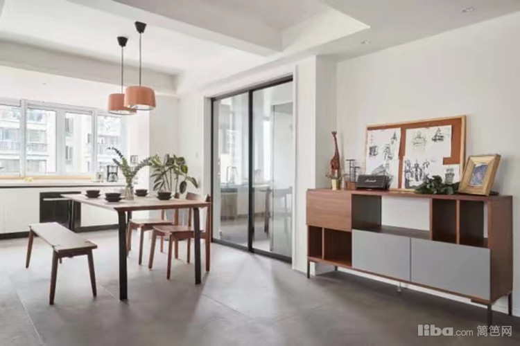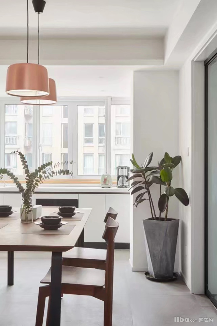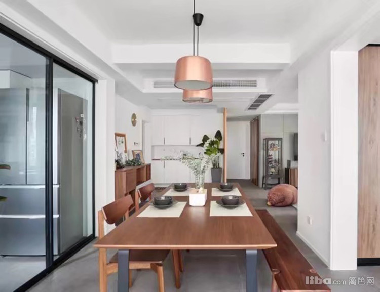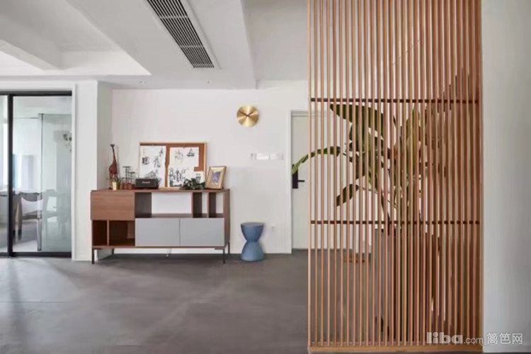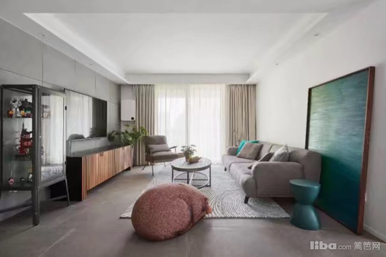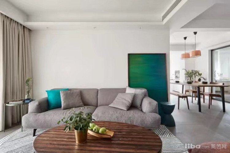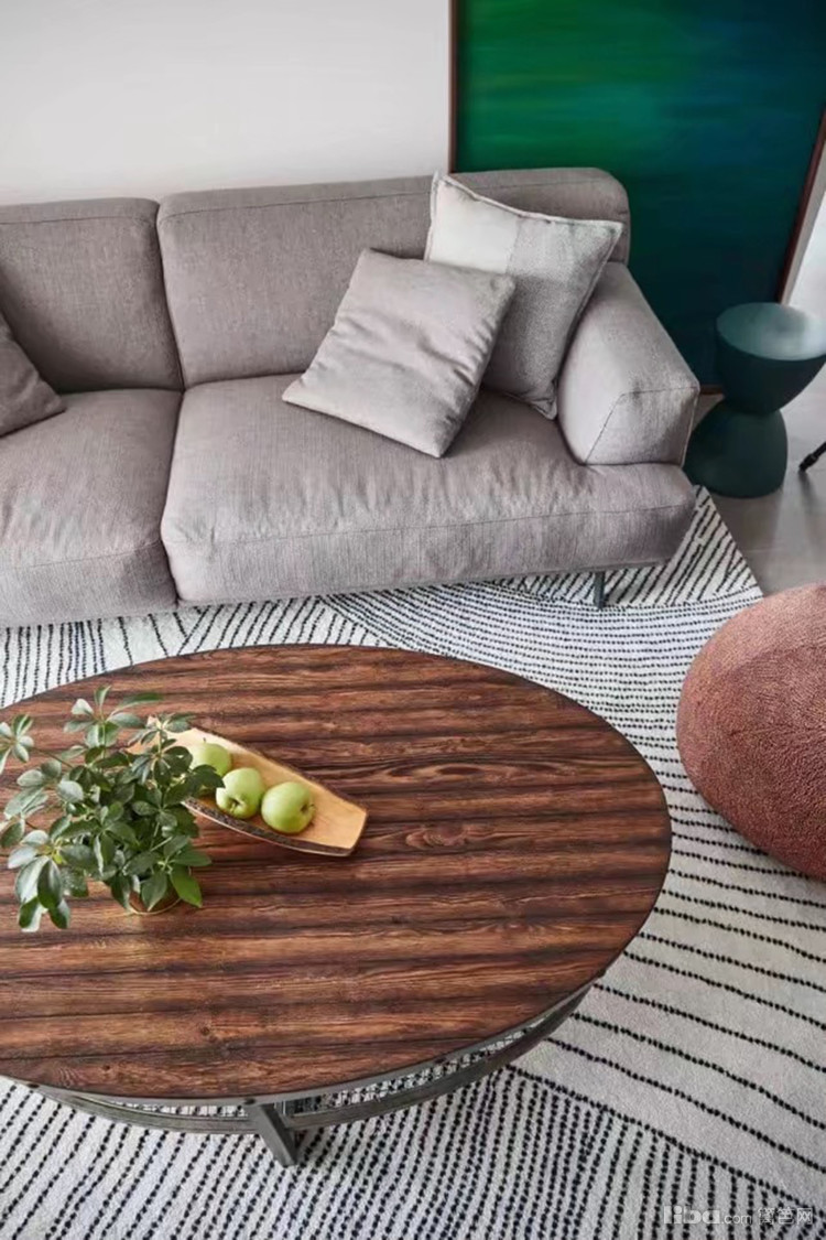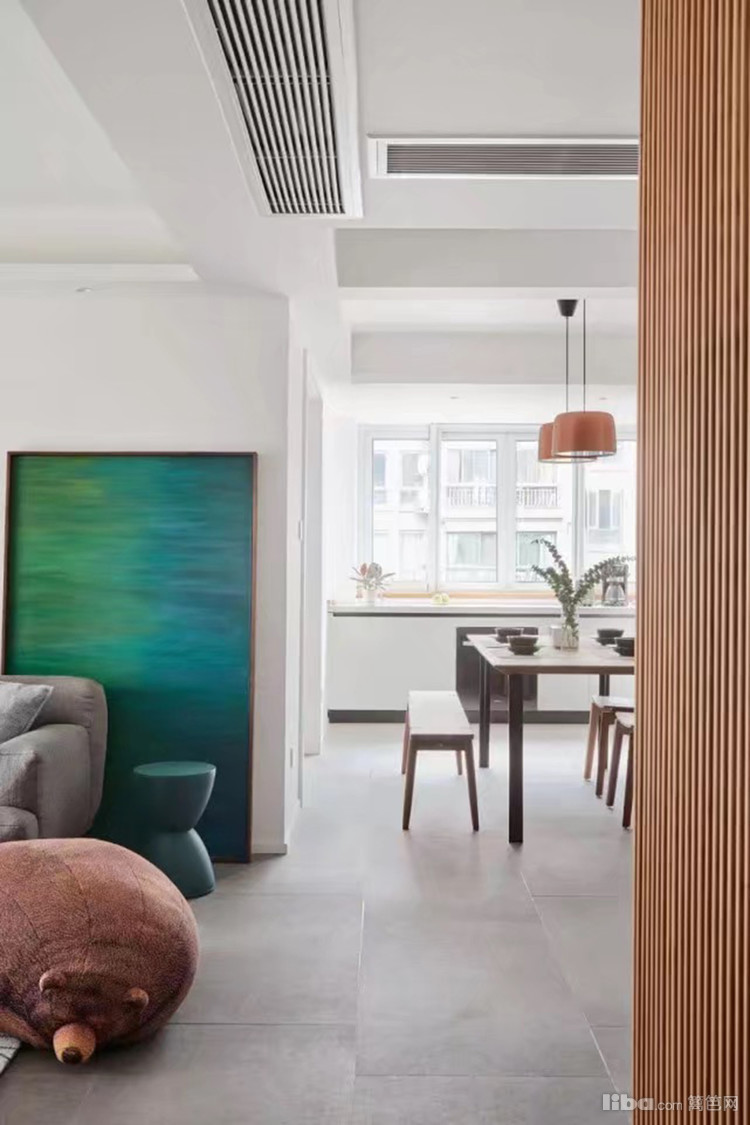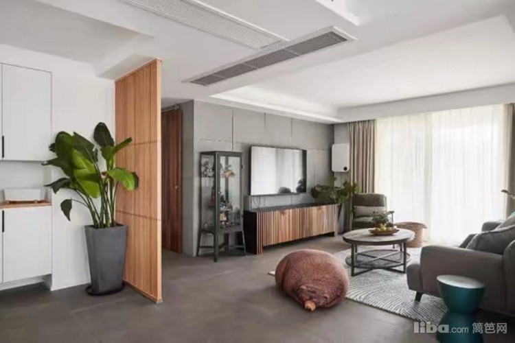 客厅做了吊顶,做了中央空掉,暖灰色的地面处理配上白色及浅灰色的墙漆,与木色家居很搭配