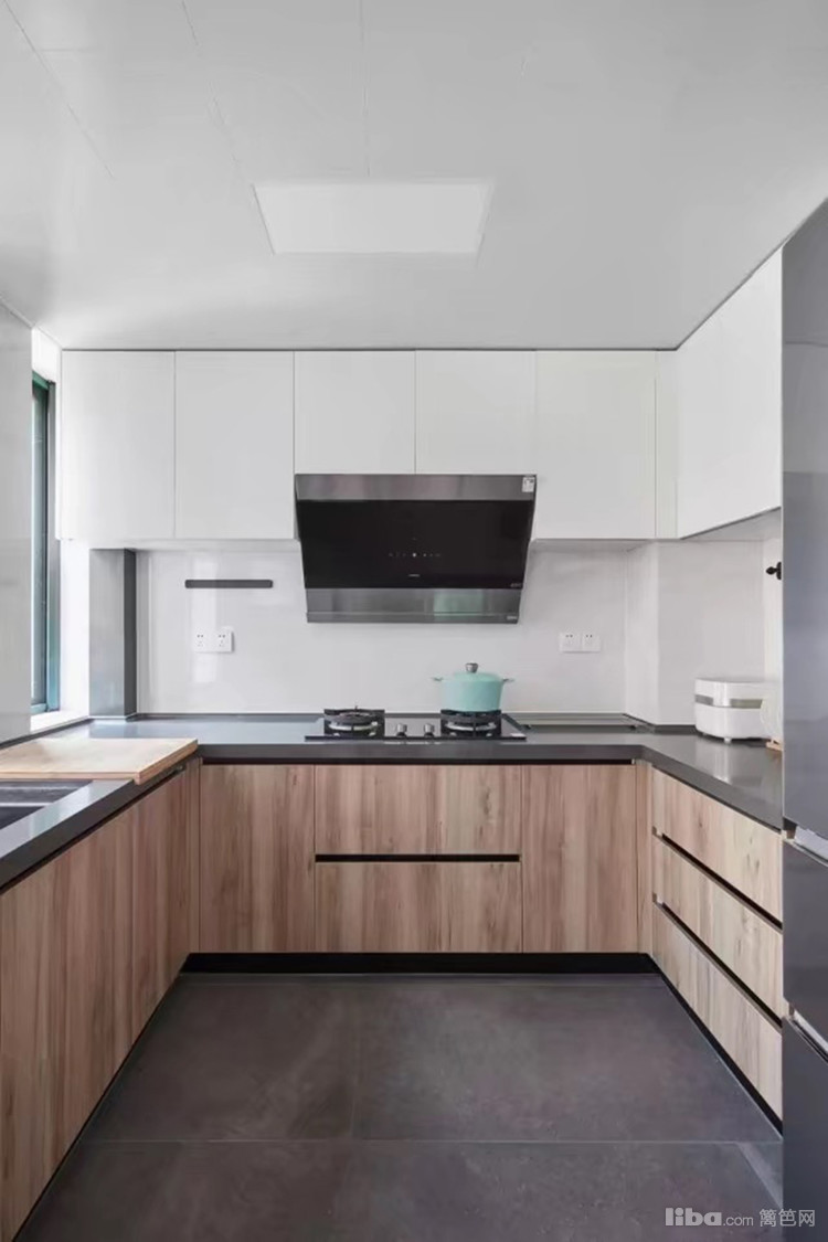 厨房沿用外面空间的整体色系,木色地柜配白色吊柜,U型设计空能全