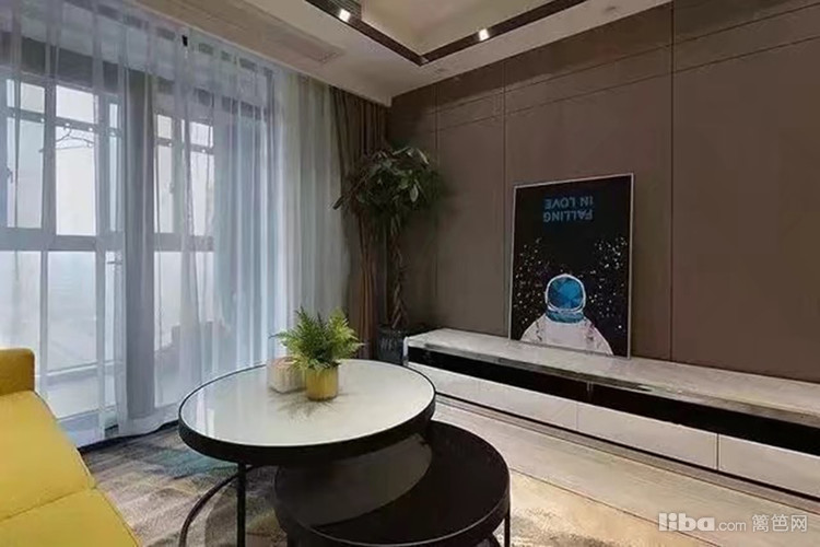 电视背景墙用木质板材装饰+大理石台面电视柜,搭配有爱的科幻片话,很温馨