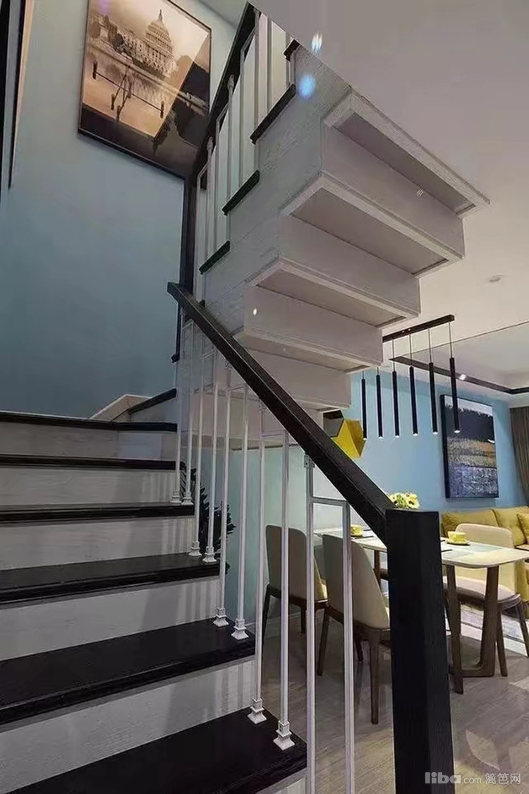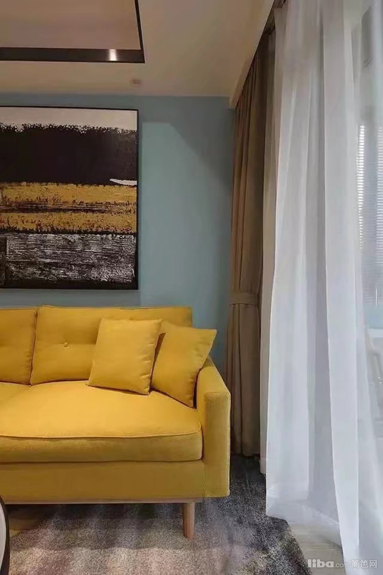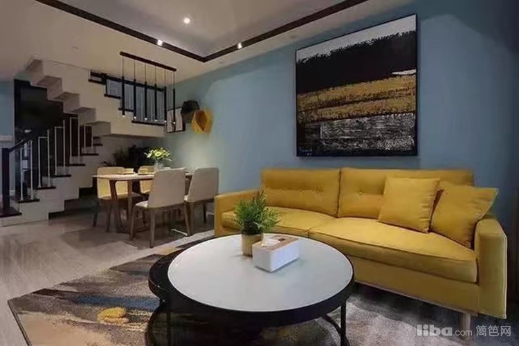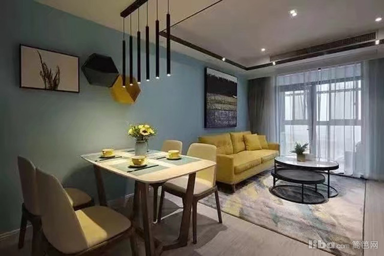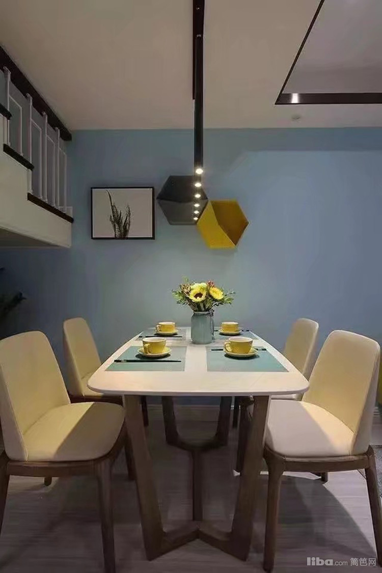 淡蓝色乳胶漆装饰,餐厅的背景墙用黄+黑装饰品点缀,现代时尚气息