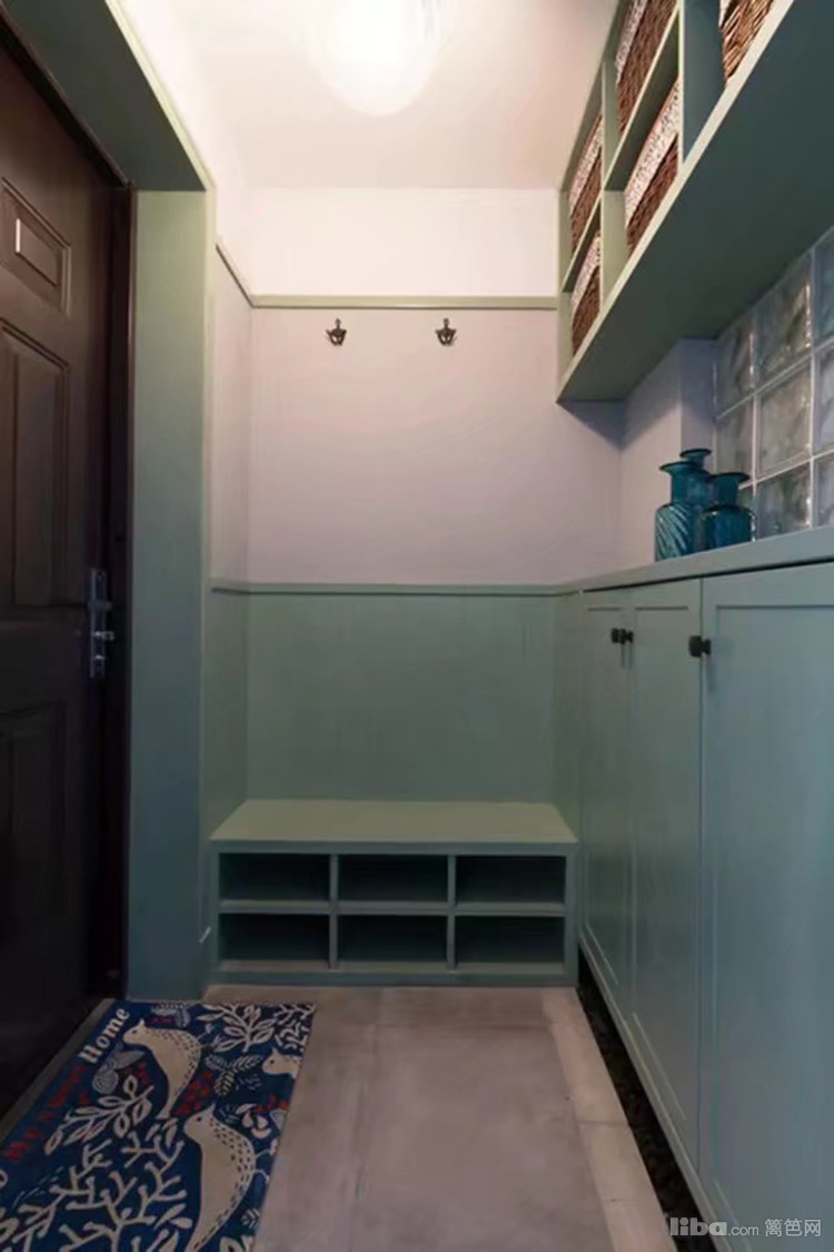 一进门是整洁的鞋柜及收纳柜,中空一段采用了玻璃砖,增加了玄关的采光,换鞋凳为格子结构,功能多样化