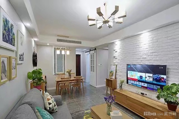 客厅,灰色双座沙发,电视背景墙用的文化砖非常漂亮,电视柜和茶几都是用原木
