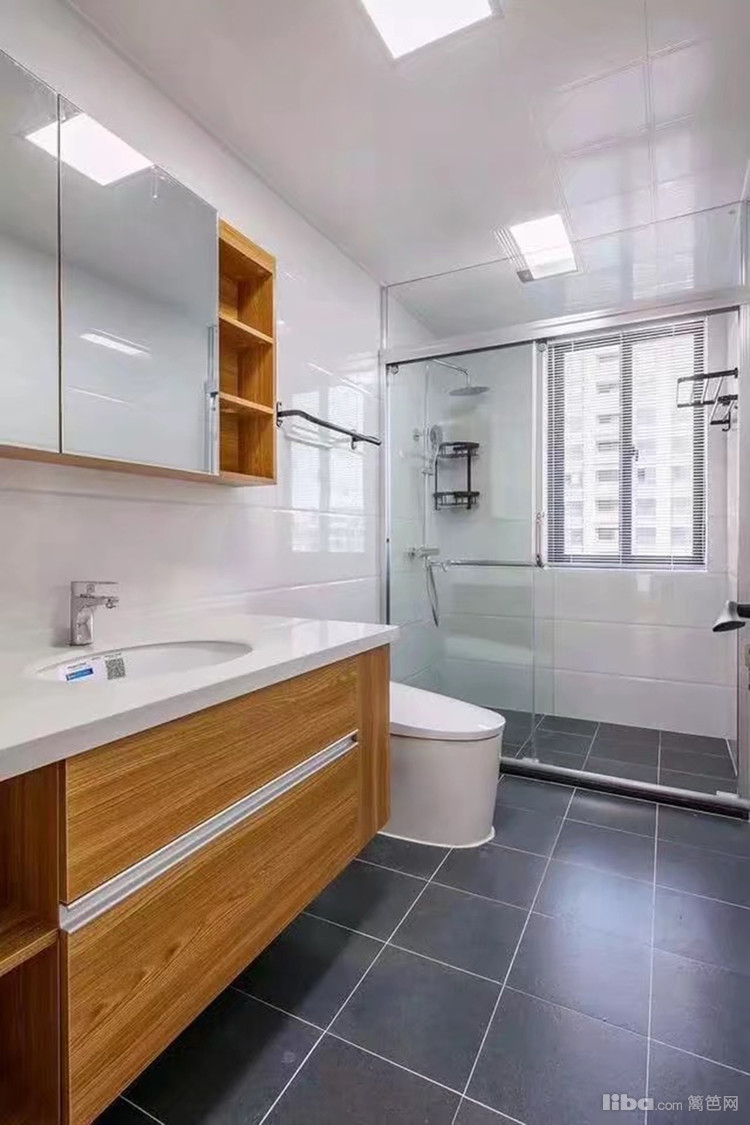 卫生间灰色地砖与白色墙砖搭配,在通透的玻璃隔断下,整个空间都显得简约而干净大方