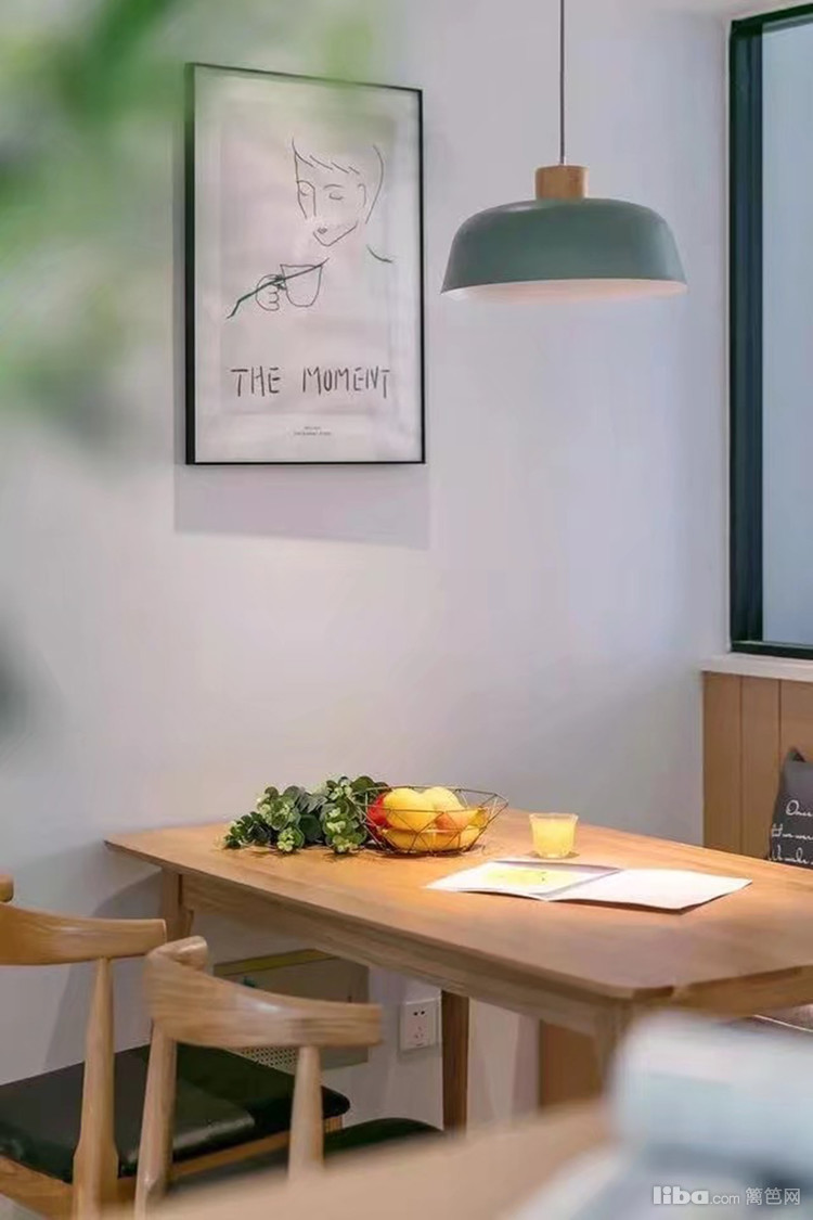 餐厅,极简的木质餐桌椅,墙面上一副简约装饰画,并搭配文艺的吊灯,让用餐氛围更加优雅