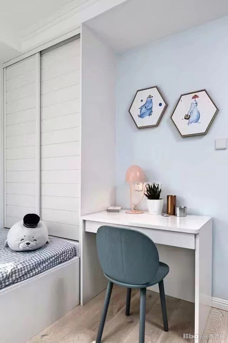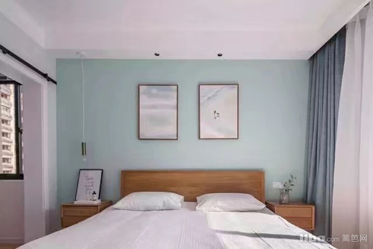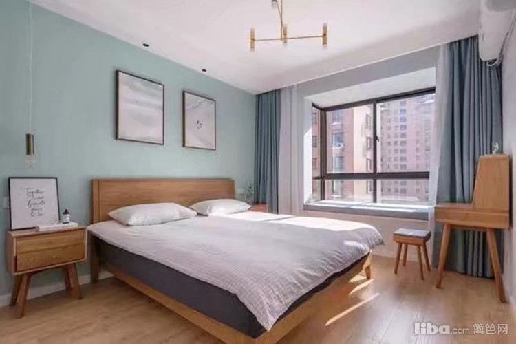 主卧在木色与清新色调的搭配下,呈现出一个温文尔雅的浪漫氛围,飘窗变休闲区