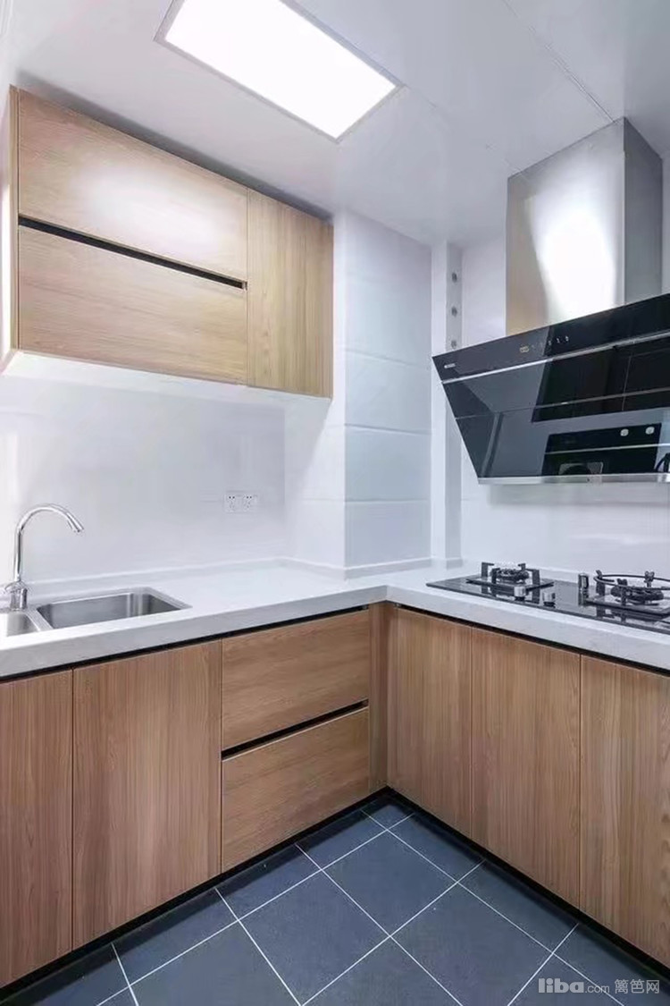 厨房木色橱柜搭配白色的墙面砖,干净又自然