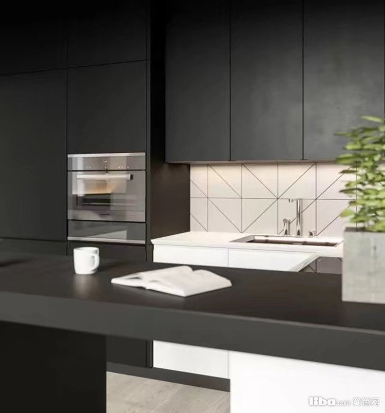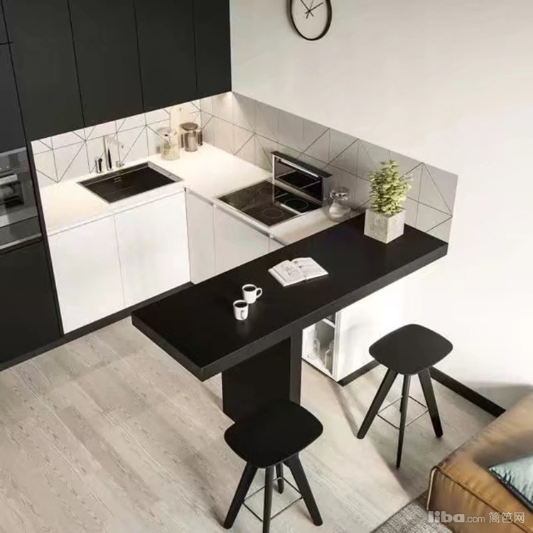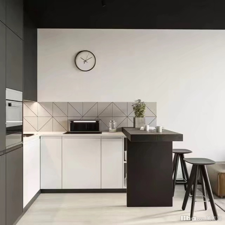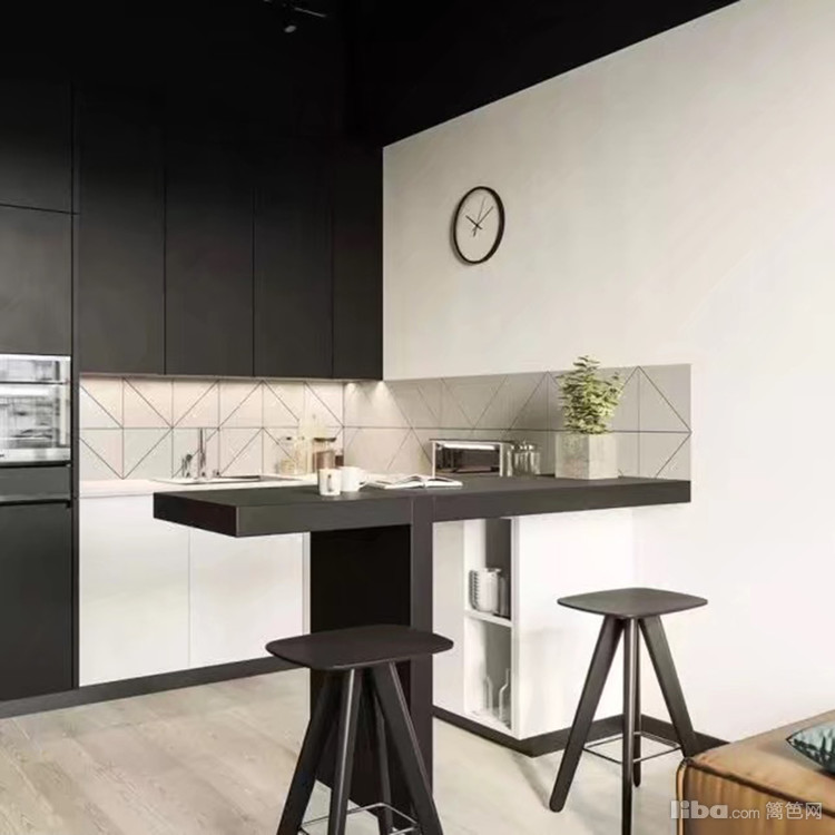 开放式厨房也采用了黑白两色,暖灰色的地板很温暖,几何形状的墙砖让厨房充满了活力和质感