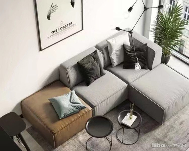 大气的灰色搭配一点姜黄色,配以北欧风抽象的挂画,线条简单流畅的茶几和灯,灰色的地毯非常的精致又大气