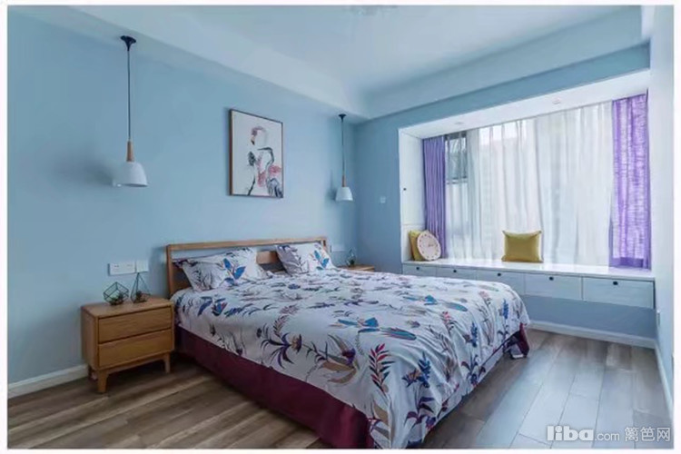 主卧室刷了蓝色乳胶漆,飘窗上砸开部分做了抽屉,增强卧室的储物功能