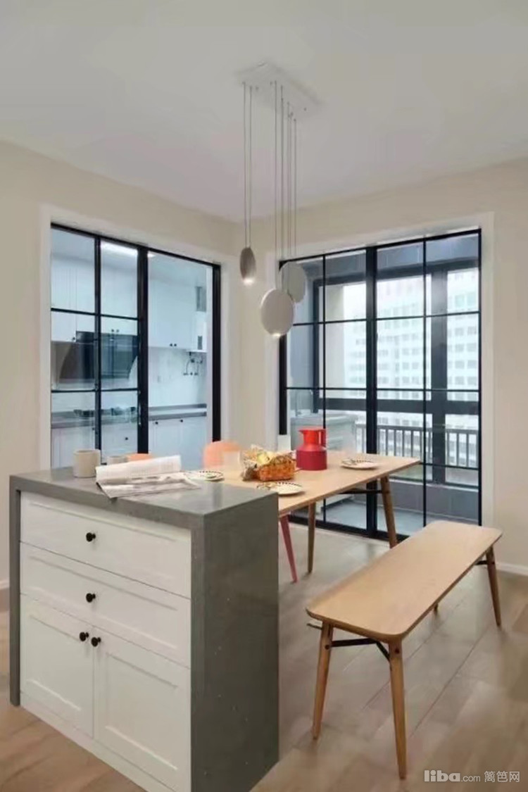 餐厅采光很好,与厨房和阳台相邻,通过玻璃移门隔开,三盏吊灯造型别致,纯质设计,超有格调,原木色餐桌椅,搭配灰色餐边柜,营造温馨的就餐环境