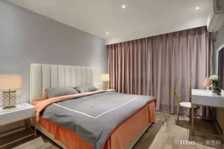 卧室空间十分宽敞,背景墙整体刷上了一层灰色,床头灯橘黄色与床单交相辉映,梳妆台方便女主人日常打扮