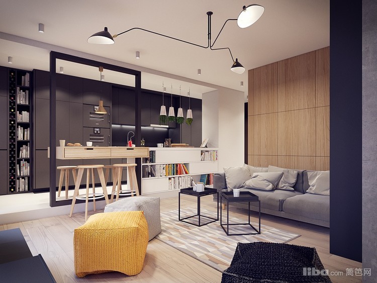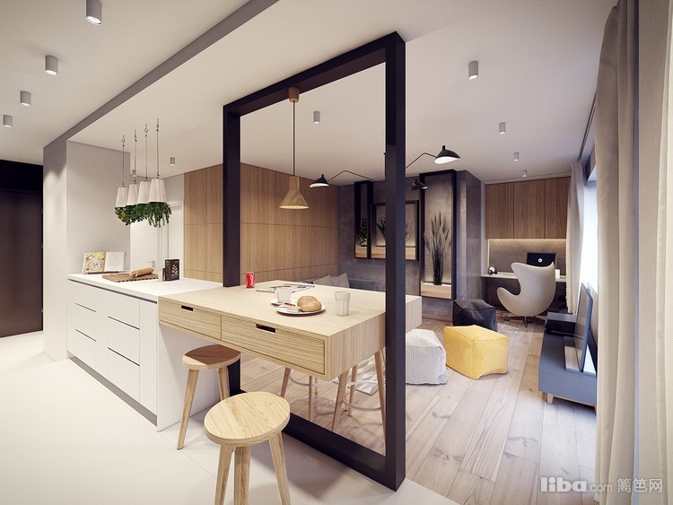 计师根据户型的特点将原有的客厅和厨房的隔墙做了拆除,用了操作台、书籍收纳矮柜和餐桌做了分割,几个不同