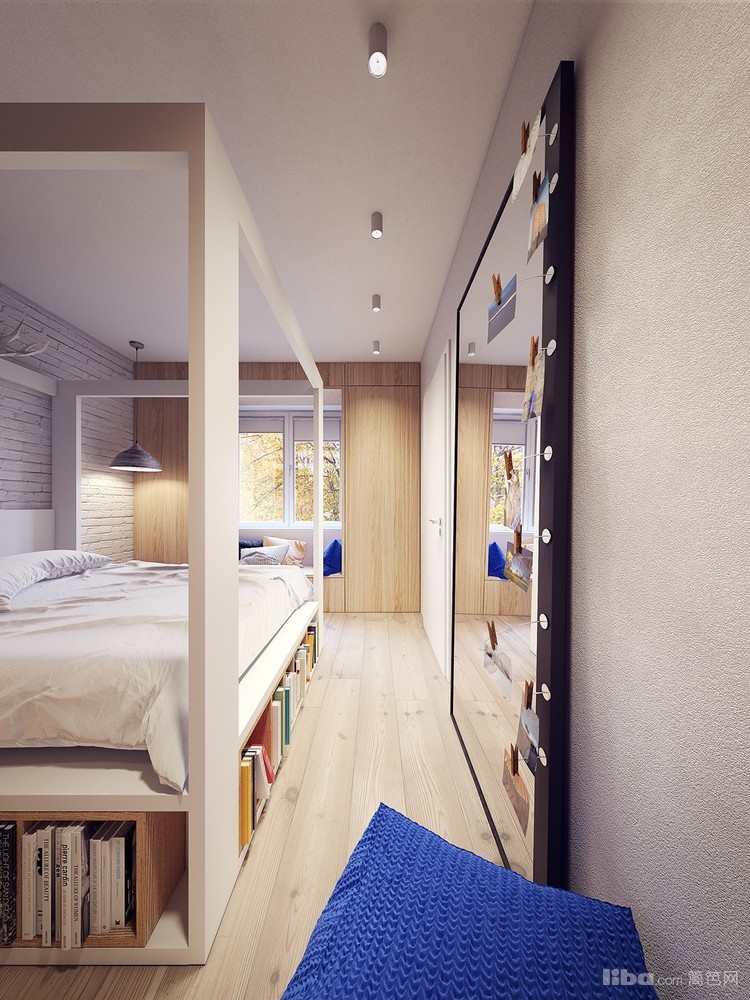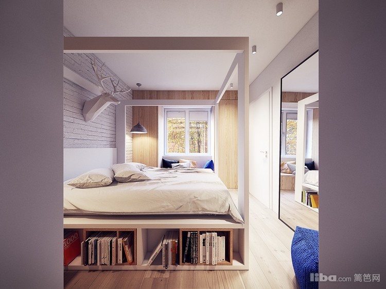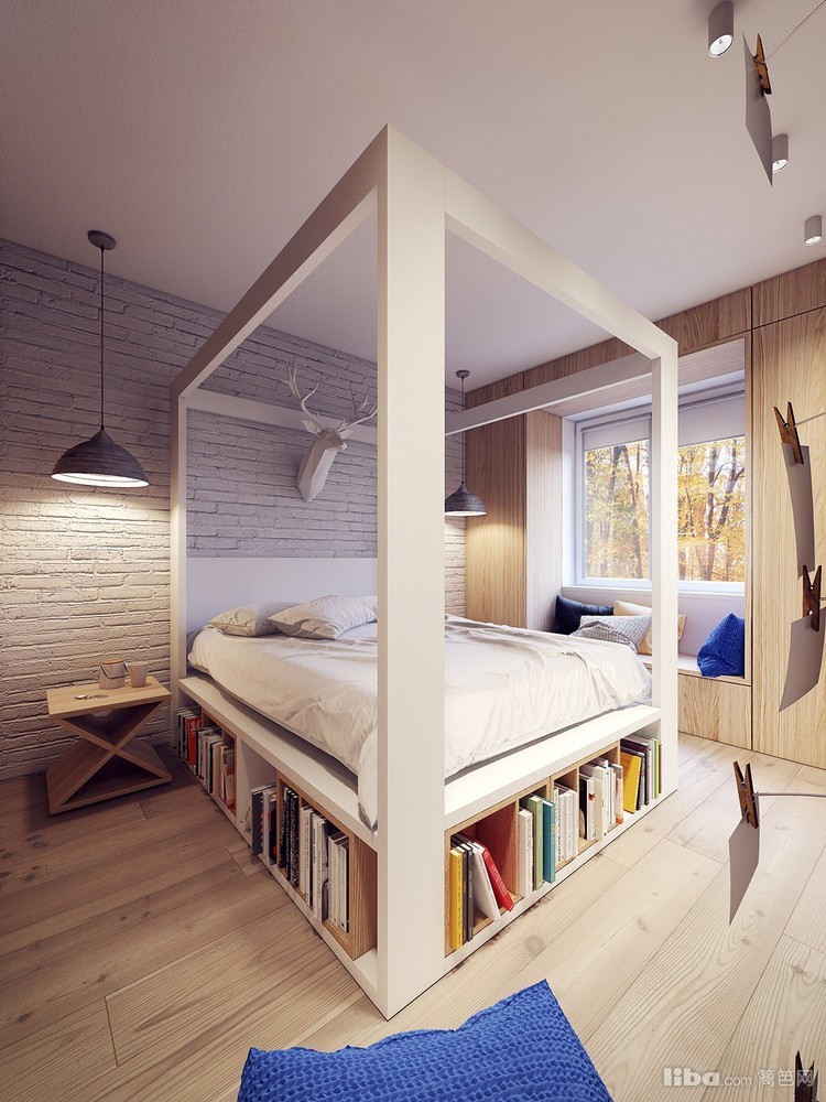 床是定制的,下面放满了书,看来业主很爱看书,复古文化砖、配木饰板墙饰、简约榻榻米飘窗能收纳又能坐着休息。