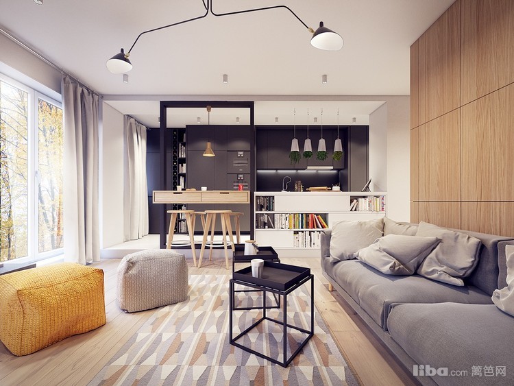 客厅的沙发背景做了木饰板硬包,浅灰色的沙发,简约造型的黑色茶几和几个针织的座椅表达了自由和舒适的意义