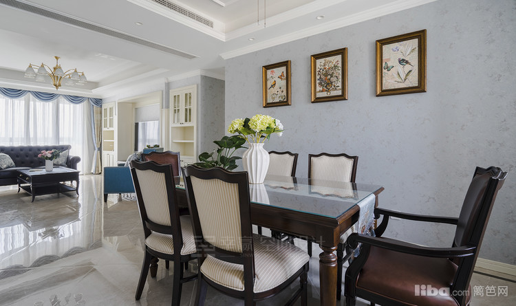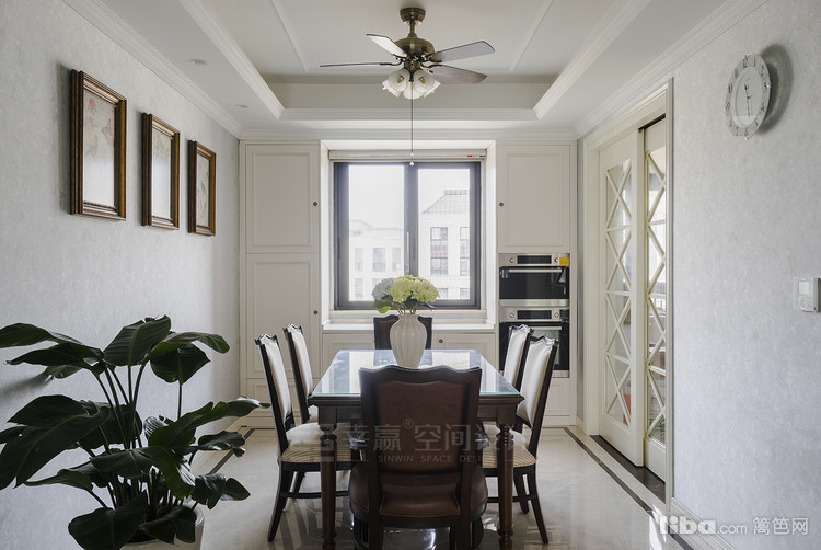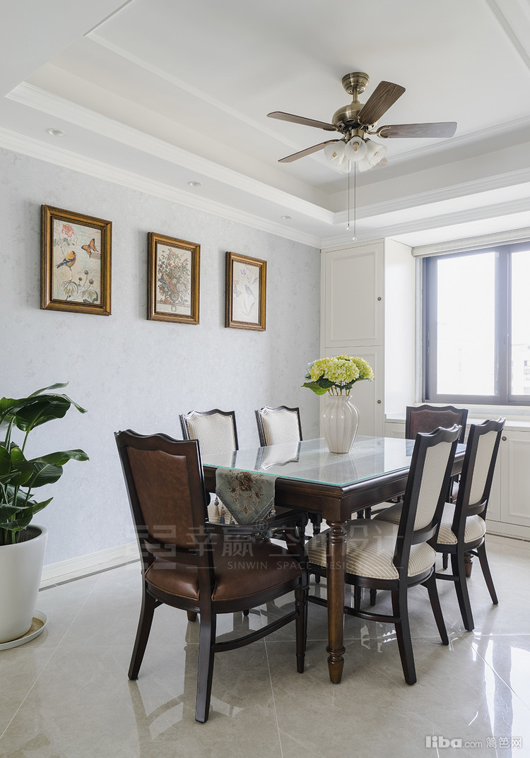 餐厅与客厅风格色彩形成统一,简美的餐桌椅,餐边柜加组合电器柜功能性强,操作简单方便,同时也解决储物功能。