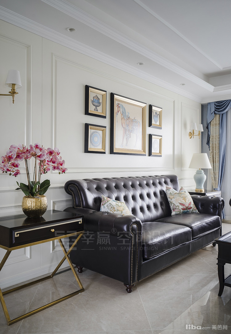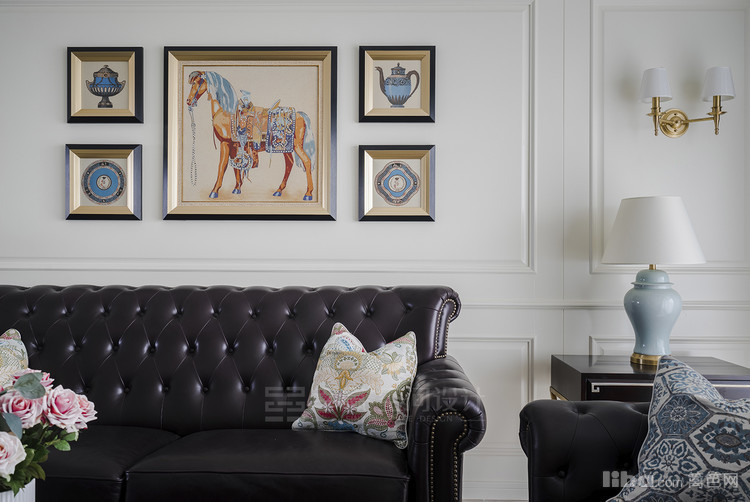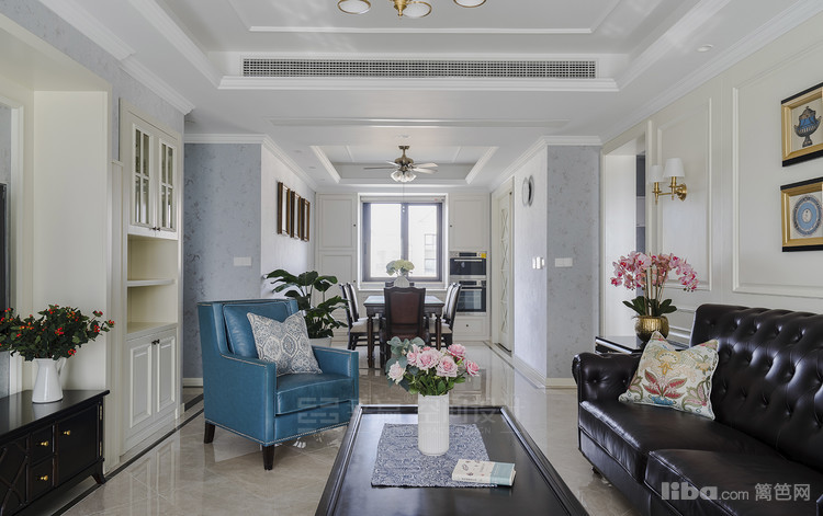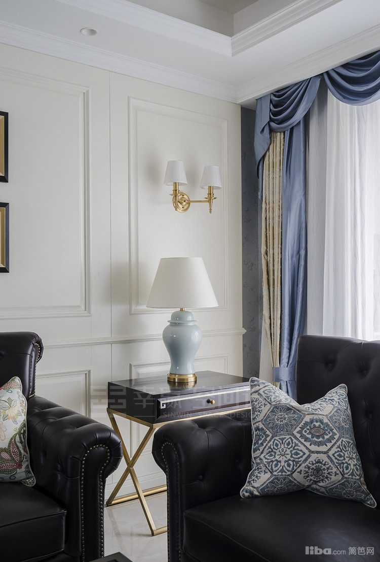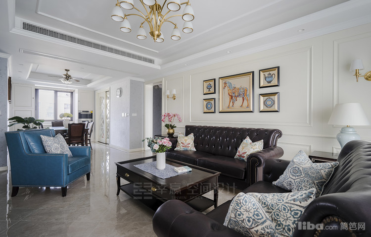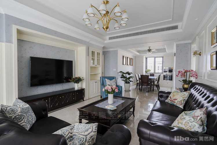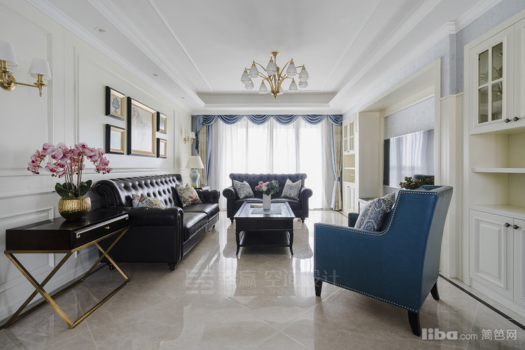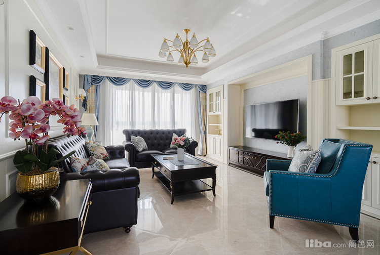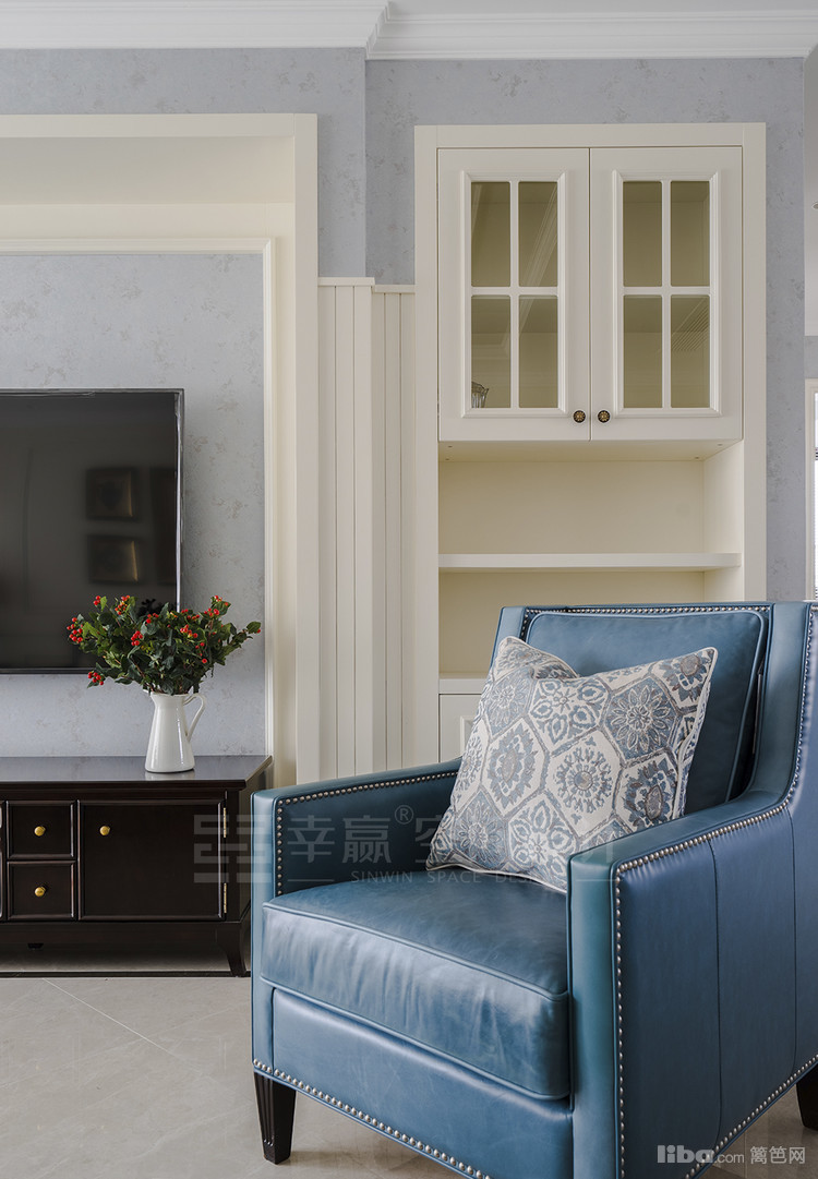 整个空间选用蓝白色调,深褐色皮质沙发和深蓝色单人休闲沙发装点,白色背景墙上的装饰画与简约的电视背景墙体现了一种“简约的奢华”,绝对是1+1>2。