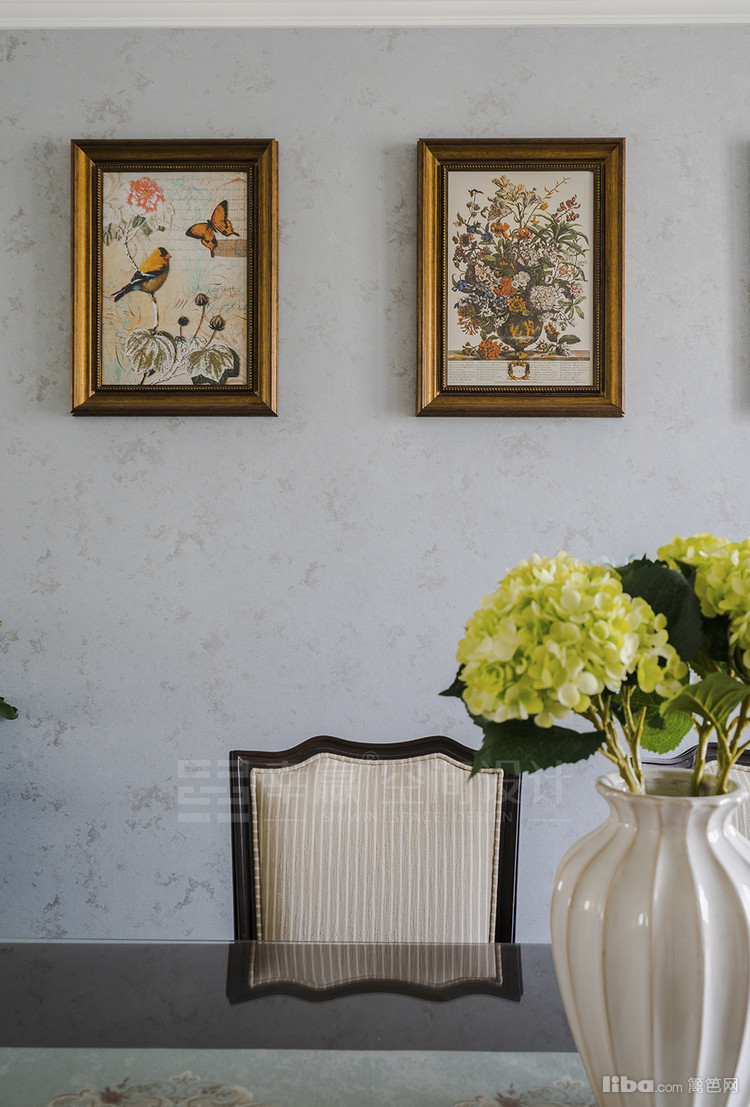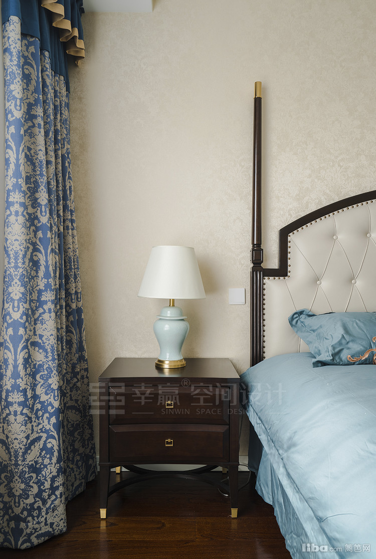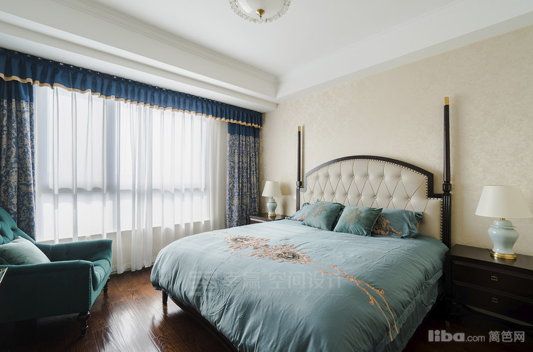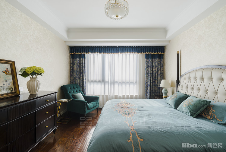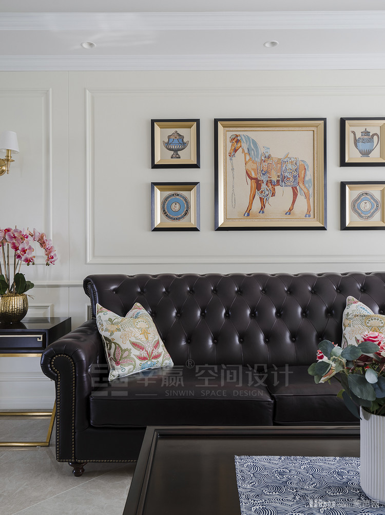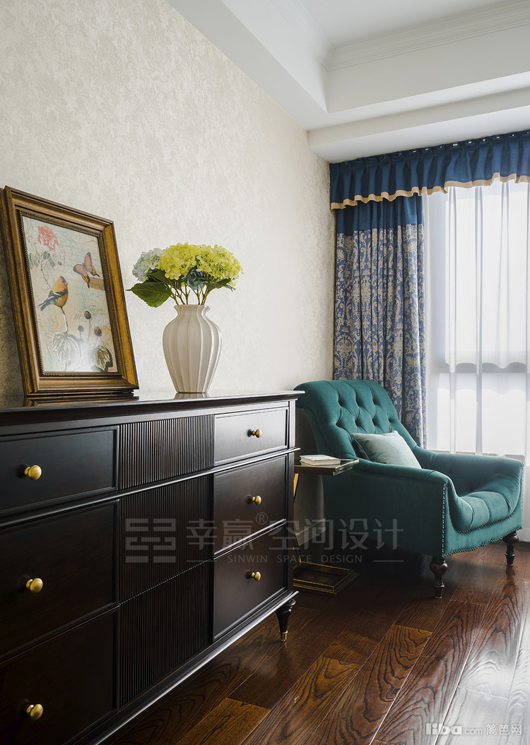 整个空间选用蓝白色调,深褐色皮质沙发和深蓝色单人休闲沙发装点,白色背景墙上的装饰画与简约的电视背景墙体现了一种“简约的奢华”,绝对是1+1>2。