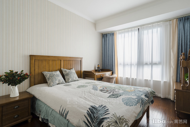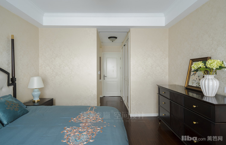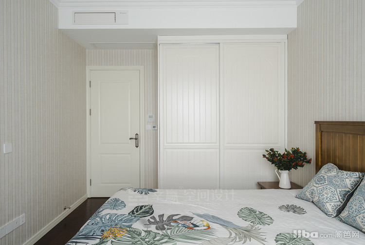 墙面铺贴淡雅的淡黄色壁纸,与白色吊顶相接和谐。睡床选用米色皮质双人床正好调和了空间的色彩,给人舒适的视觉感。