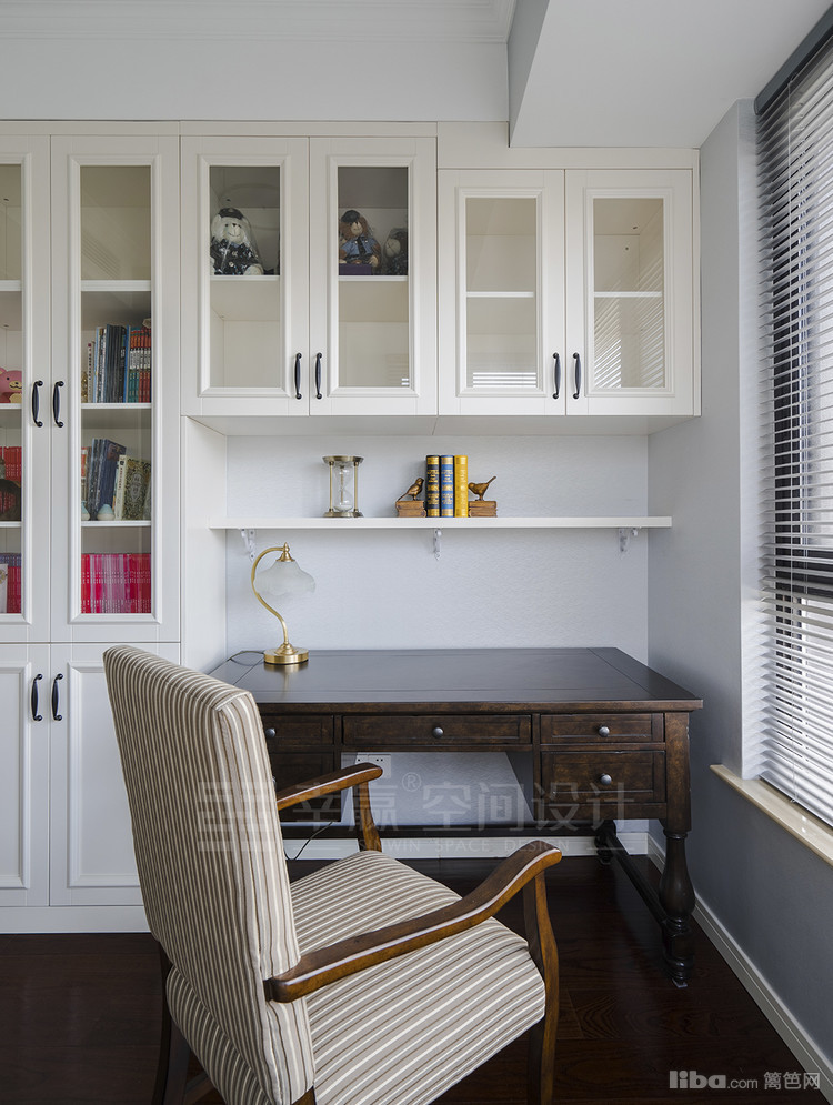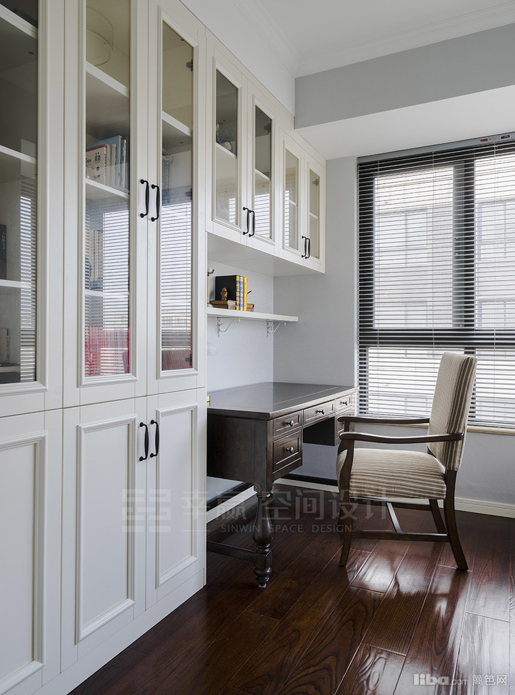 书房与其它房间保持一致的装饰感,体现整个家的统一设计。白色书柜多少书籍都能摆得下,写字台上书架+书柜的造型打破一味书柜或书架的单调感,令墙面书柜丰富而实用。