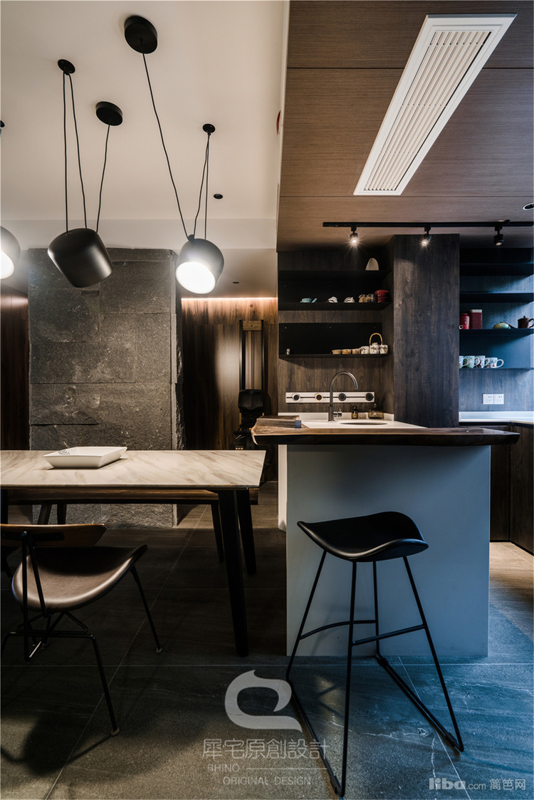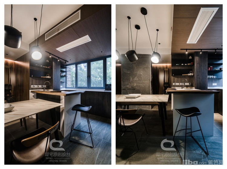 利用北阳台的空间做出了西厨,空间足够大,而且这样一来餐厅位置也显得更开阔了。西厨墙顶面都贴了木饰面,让空间更具有整体感和延伸性。用钢板代替普通木质隔架,和整个风格更搭配。