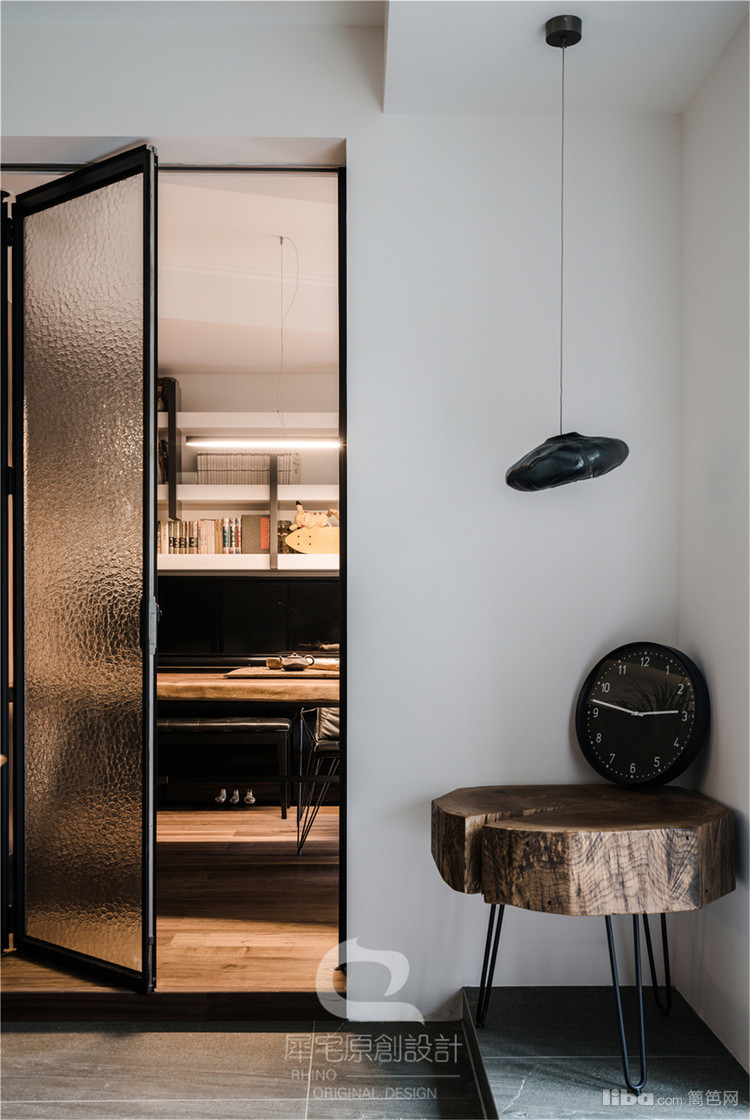 为了将原有过道加以利用,改变了主卧房门位置,以隐形门形式隐藏在电视背景墙当中。沙发背后是男主人最满意也最常待的书房区域。原来小卧室的隔墙拆除了,用一面折叠玻璃移门替代。
