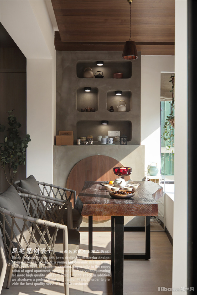 阳台的茶桌空间是我和猫猫最喜欢的一个角落,阳台一侧的壁龛结合老灶台造型,很有特色。