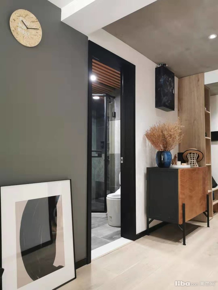原本主卧房门位置封闭,进门通道空间变成了三分离的卫生间,房门采用隐形门形式调整到电视背景墙。