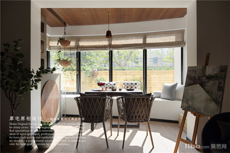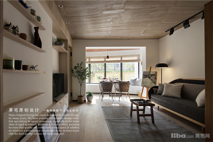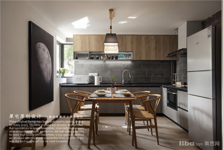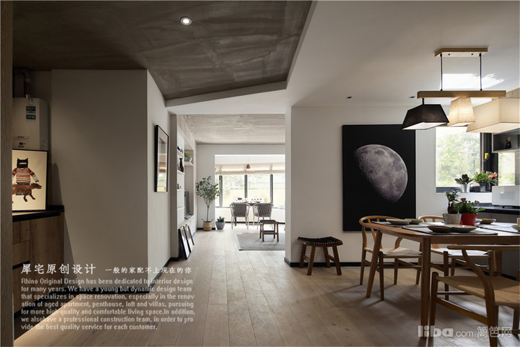 原来的次卧改造成开放式厨房,极大的改善了公共区域的空间感,站在玄关,光线贯穿整个空间。餐客厅用两种不同的材料不规则划分既有层次感,又能显得活泼不压抑。