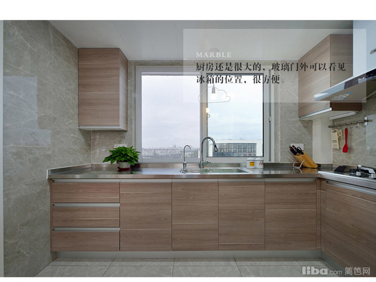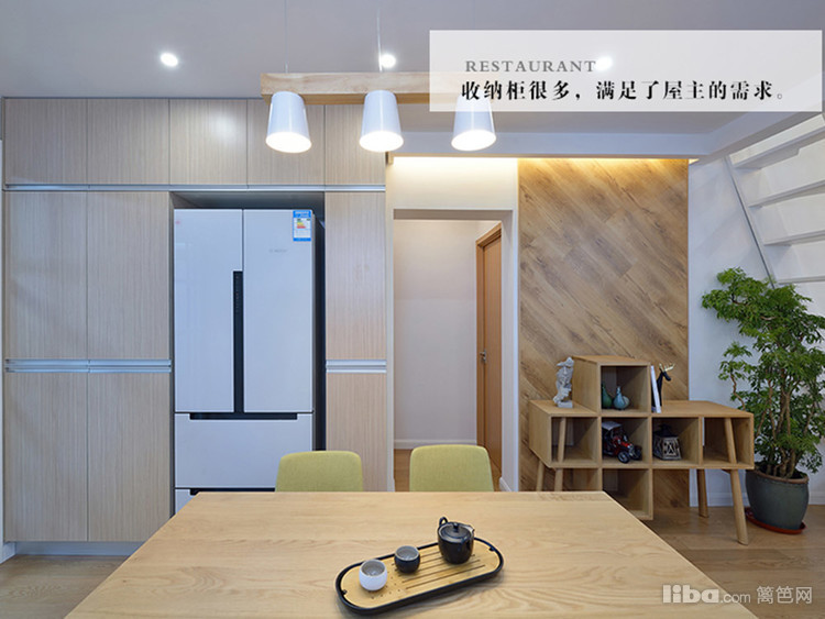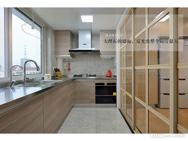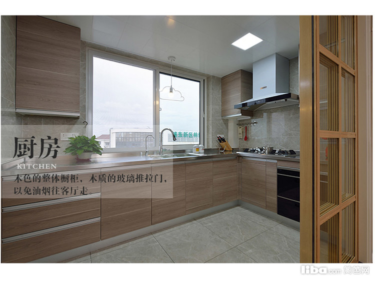 木饰面的橱柜搭配玻璃移门,耀眼急了,让厨房充满空间感。