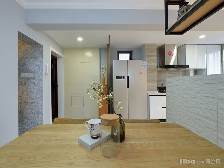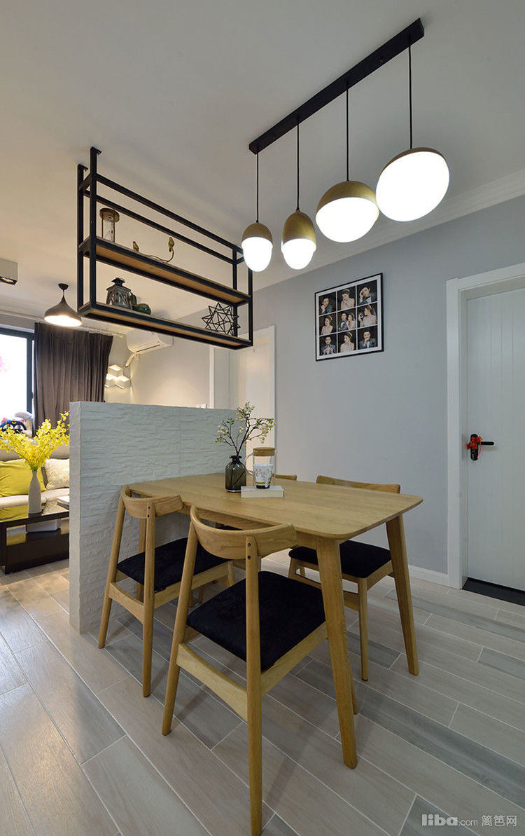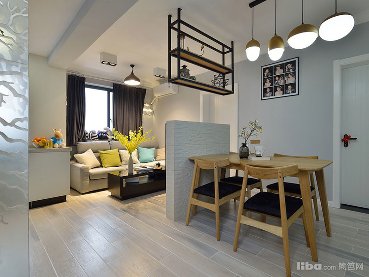 简洁的背景墙搭上铁艺的吊架,既有区分功能划分的作用还能丰富吊顶的层次。空间简约却不失活跃。