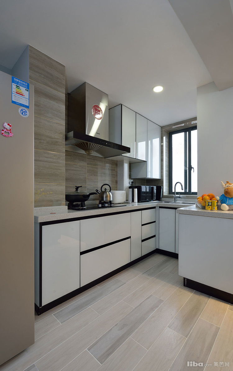 为了增大空间的视觉效果,考虑到生活的便利性采用开放式厨房的设计,整体白色基调的橱柜,配上浅灰的亮面瓷砖,显得清爽,大气,整洁。