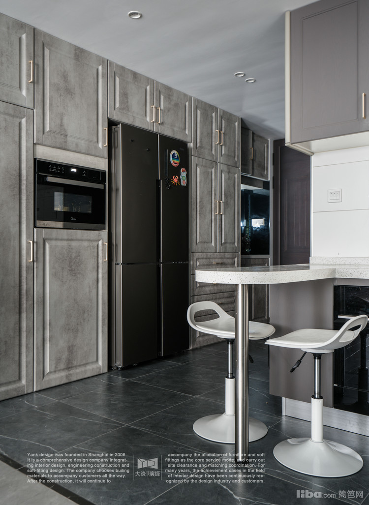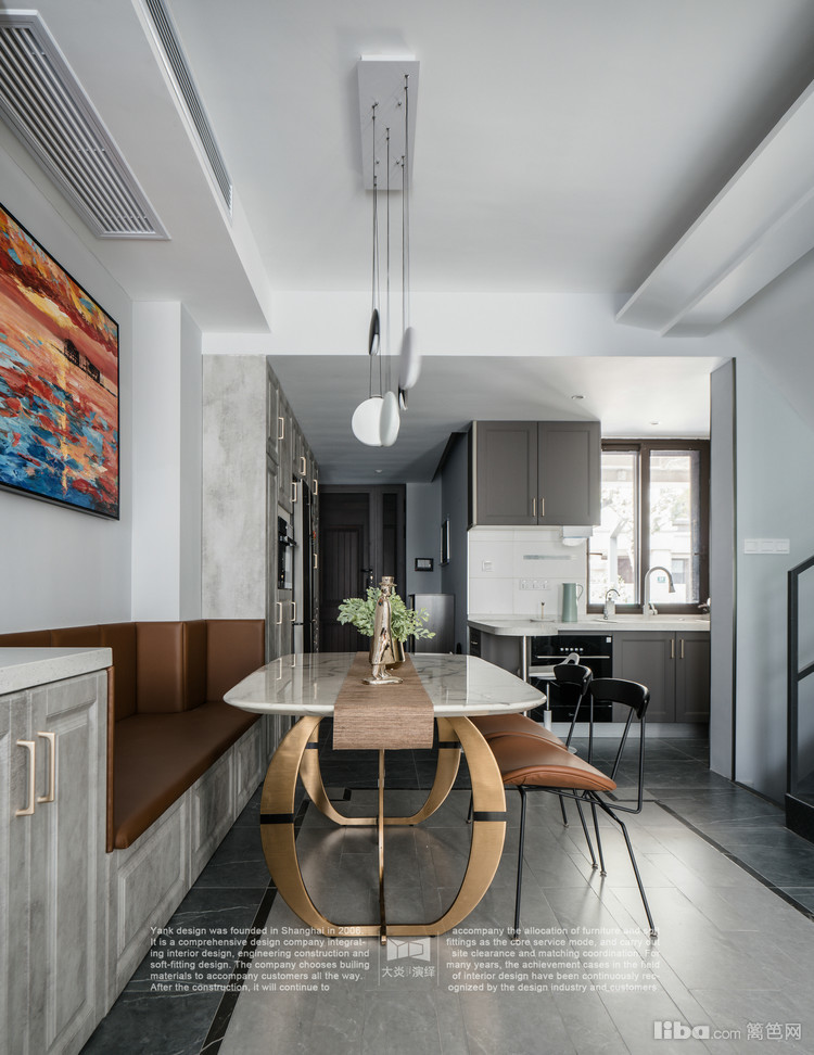 在大面积的灰、蓝调中, 金属色餐桌腿与爵士白餐桌面色的点缀很巧妙,