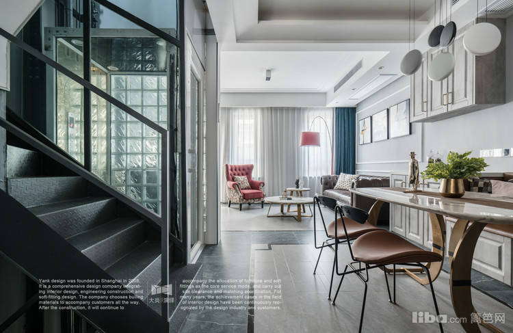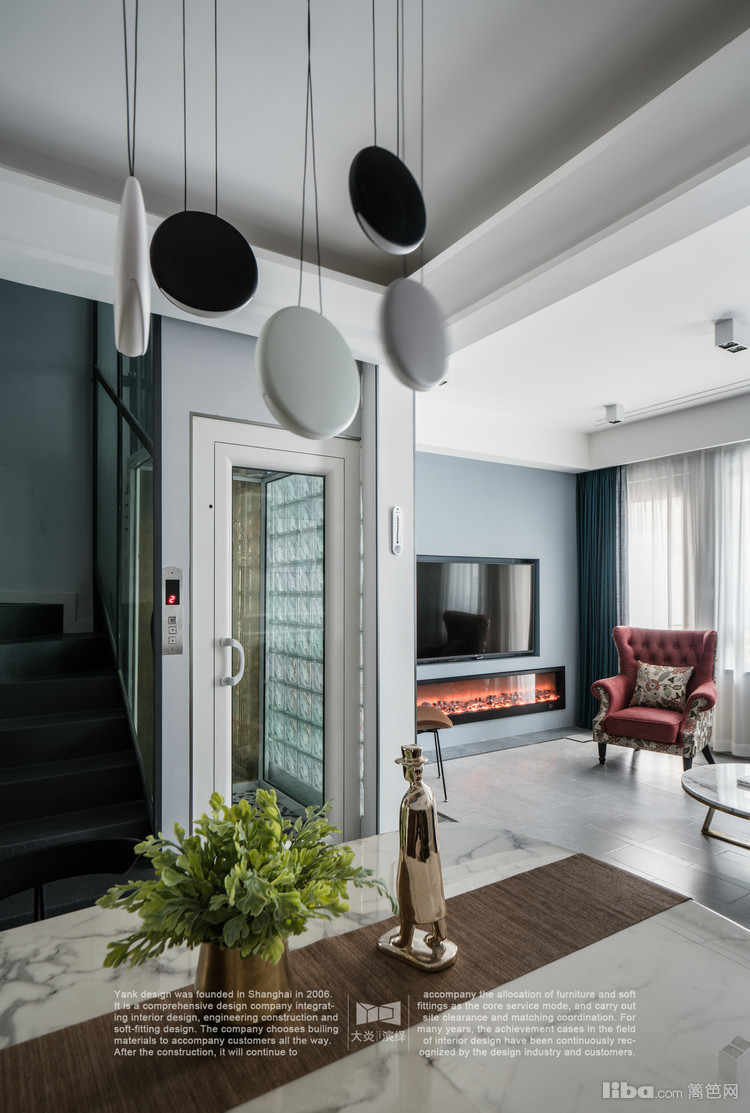 设计说明:本案是位于朱家角地下室+三层联排别墅,业主经营着一家民宿,这套房子是他与父母生活所用,所以在通往二楼的楼梯旁设计了电梯以便父母使用;