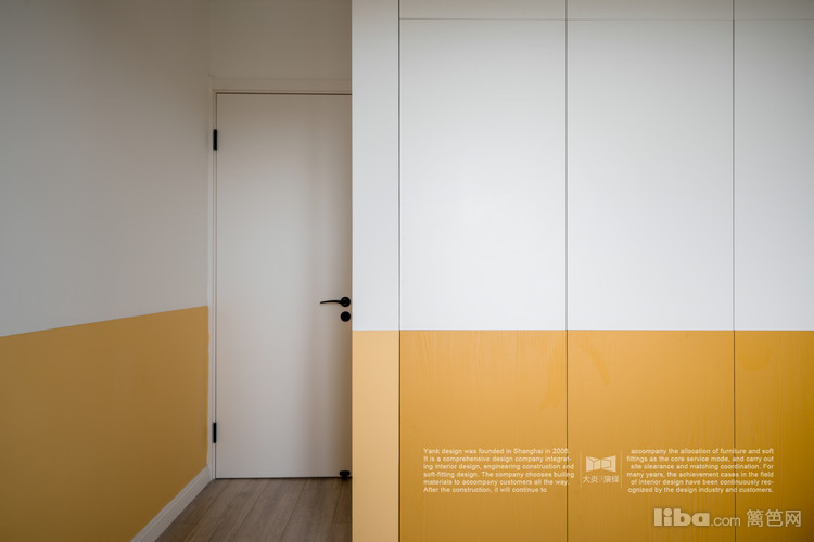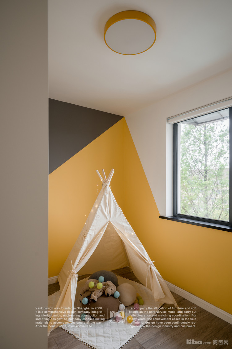 因业主目前还没有宝宝,暂时没有家具,墙面选用灰色黄色色块拼接,营造明快活泼的氛围,更适合宝宝。