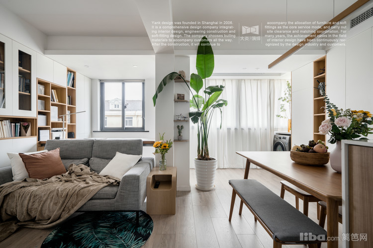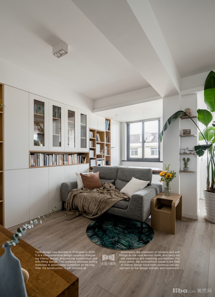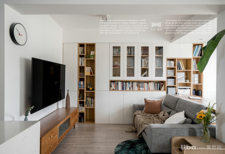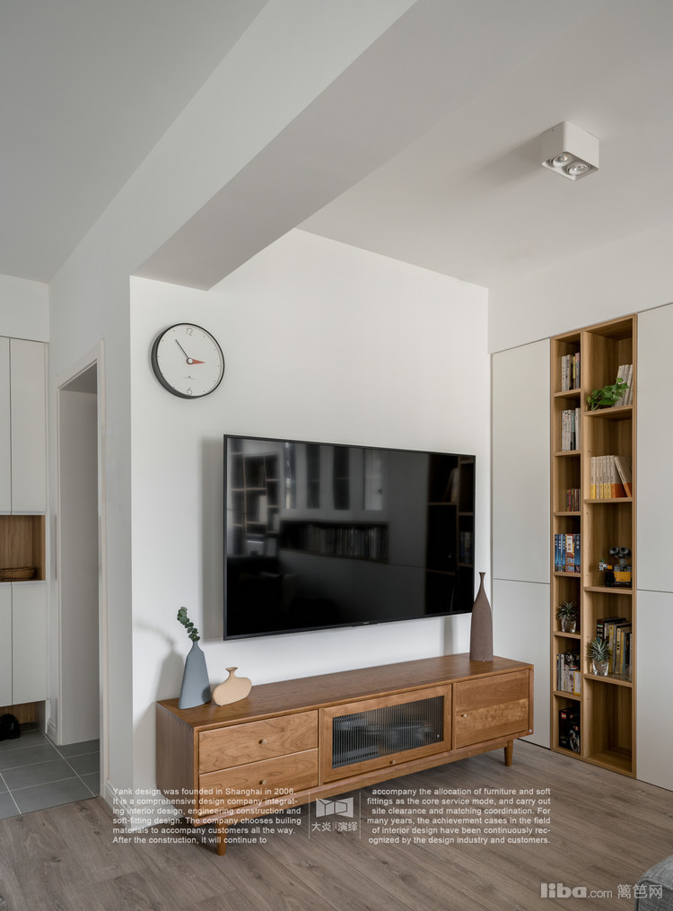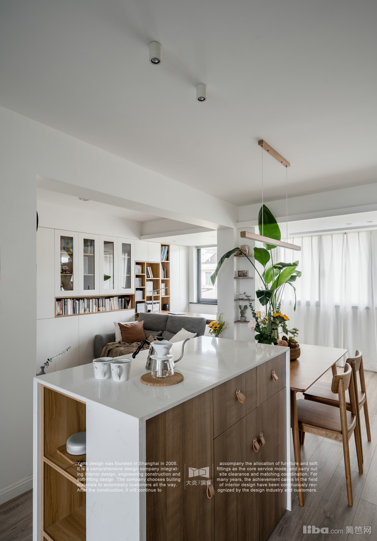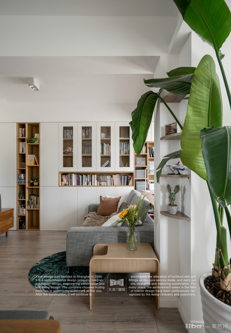调整了客餐厅的位置后,利用墙面空间做了整面储物书柜,增加收纳!