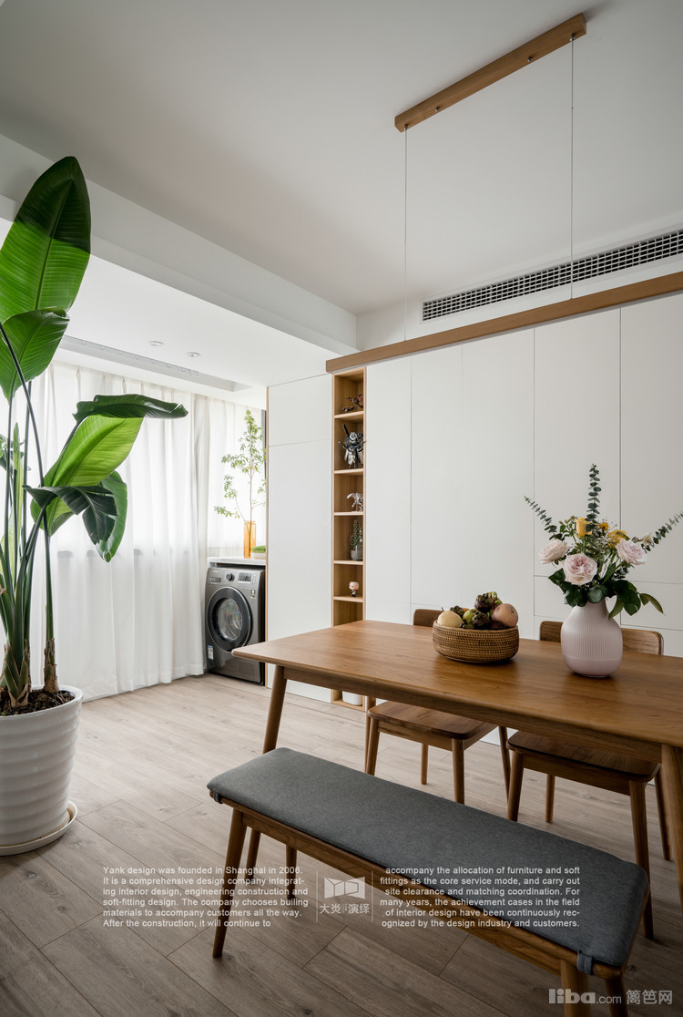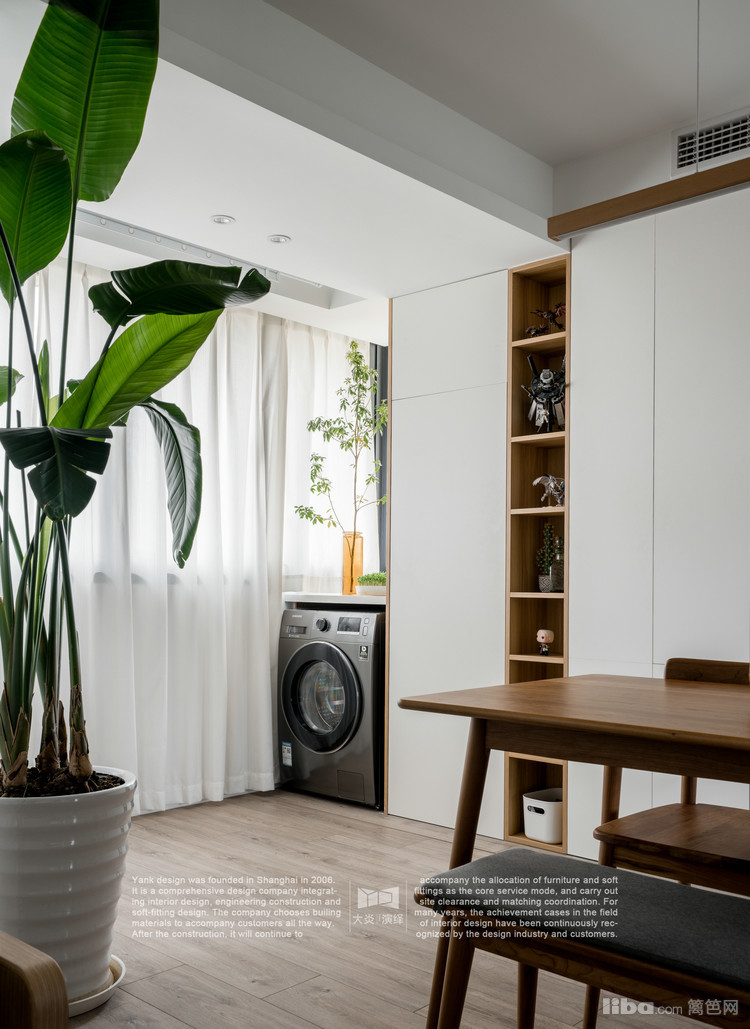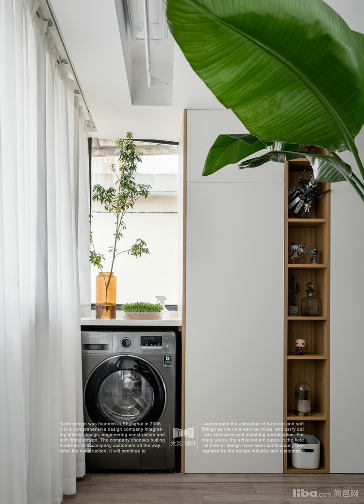 由阳台纳入室内,连接餐厅储物柜在靠窗处设置了洗衣区,顶面设计成凹槽可以挂衣晾晒!