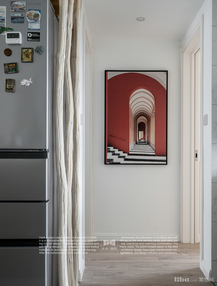 餐厅储物柜靠近厨房的一边安置了冰箱,精挑细选了几根白色树干做装饰,与过道红色拱形建筑物装饰画,也能拍出好看的视角!