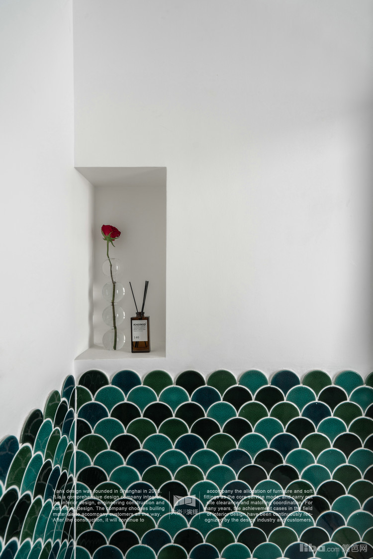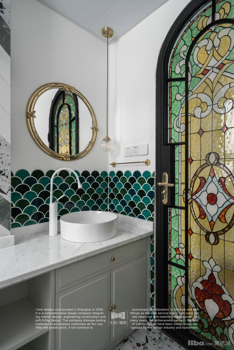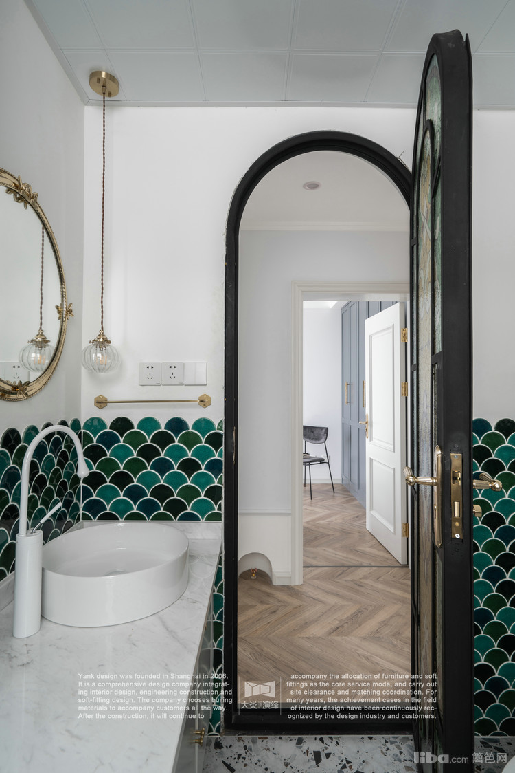 卫生间墙面上半部份的大量留白,主要以人字拼的菱形砖,还有羽毛砖的马赛克去做了一些点缀,营造一个法式的基调。
