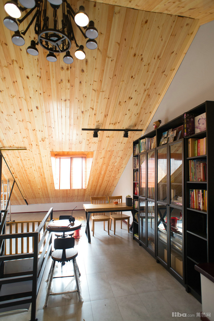 阳光透过原木天花板洒落在书桌前,时光静好