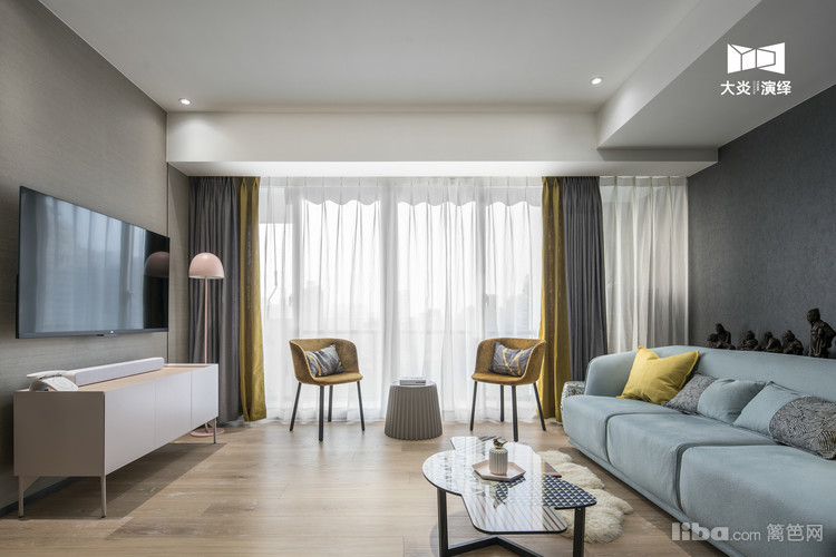 不规则造型的茶几配以雾霾蓝布艺沙发,简约而不简单。
