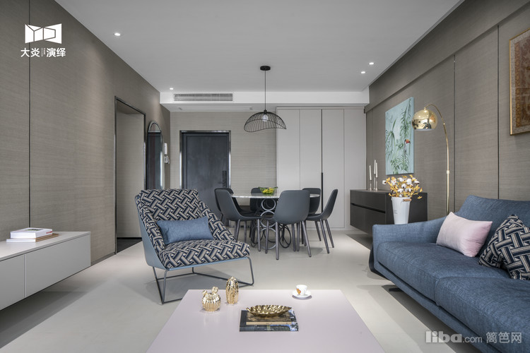时髦有气质的蓝与灰,是空间的主色调,墙面是低调又高级的阿玛尼壁纸,搭配金属落地灯则成了点睛之笔。