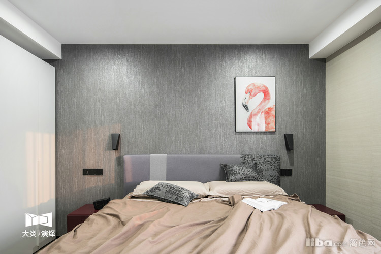 休憩空间注重家具和装饰的舒适,软包床结合深灰色竖纹壁纸,配套绛红色床头柜与白色衣柜,相互衬托;